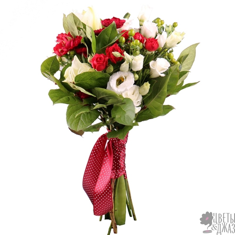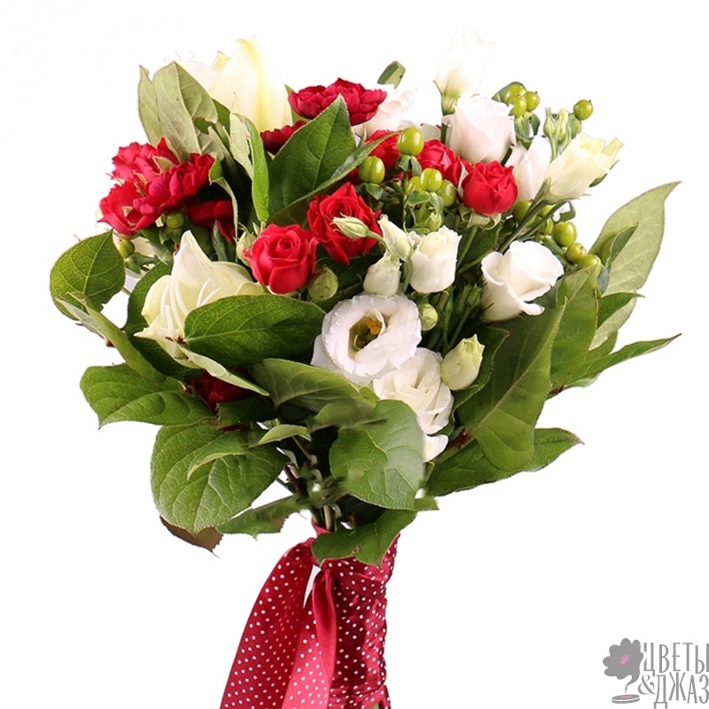 Букет состоит из 5 кустовых роз, 2 ветки эустомы, 1 амариллис, 3 гиперикум, зелень, прозрачная упаковка, атласная лента.