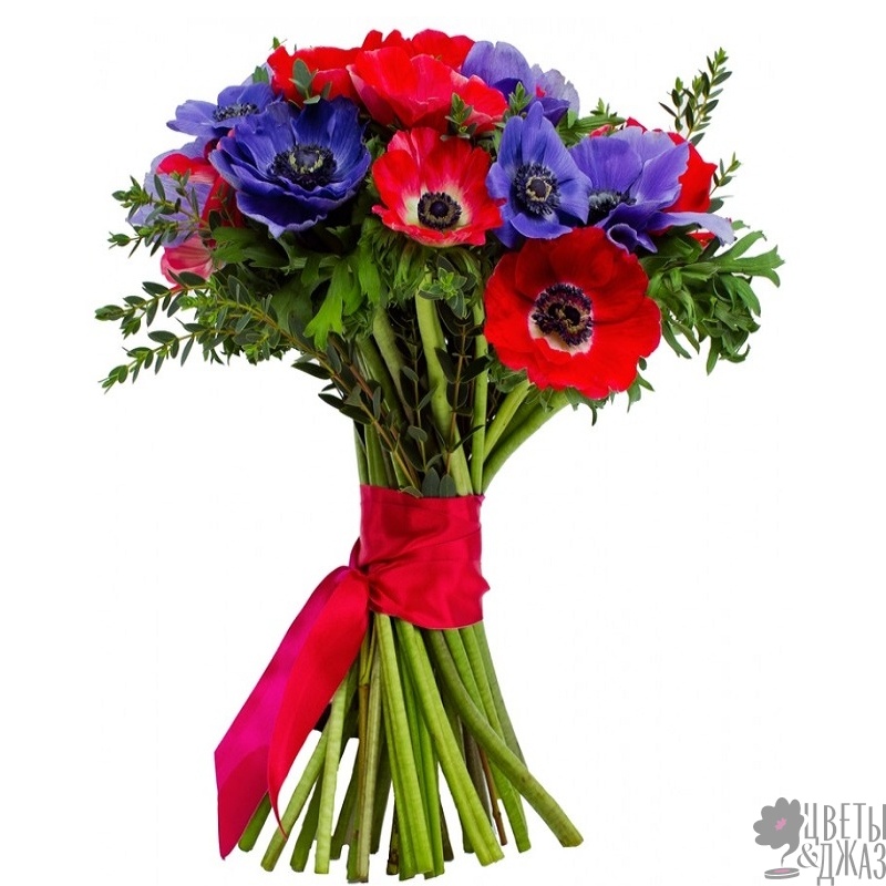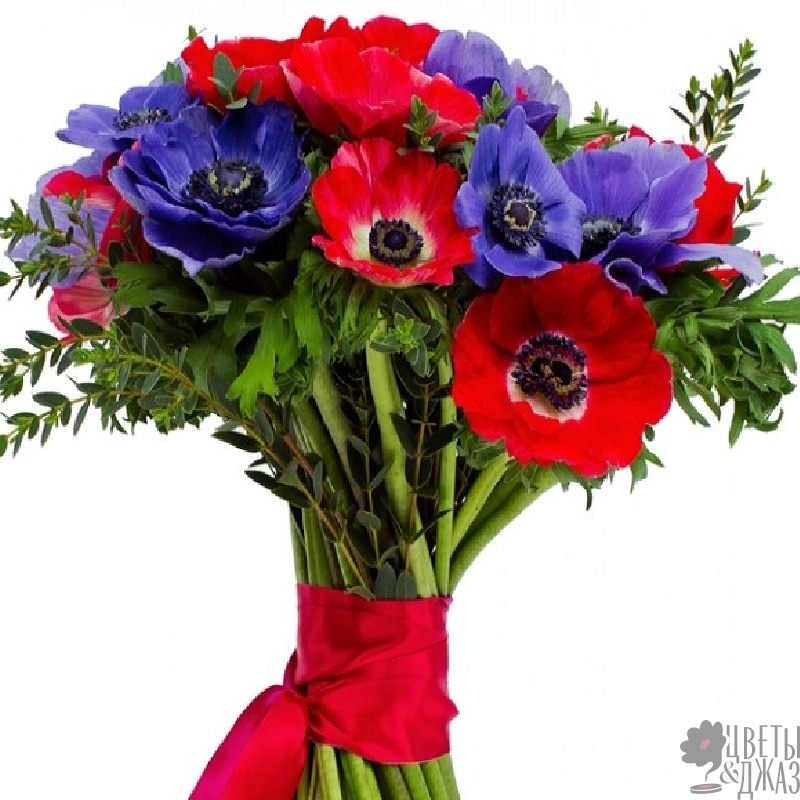 Букет состоит из 10 красных анемонов, 9 синих анемонов, зелень, прозрачная упаковка, атласная лента.