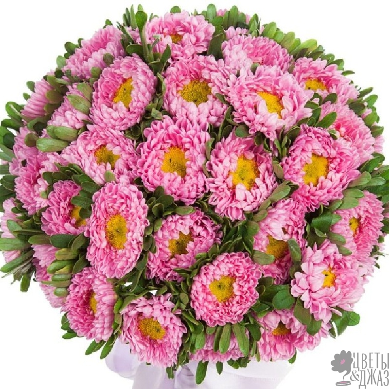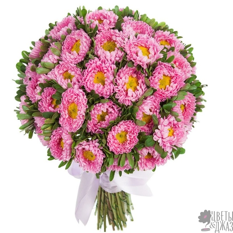 Букет состоит из 51 розовая астра, зелень, прозрачная упаковка, атласная лента.