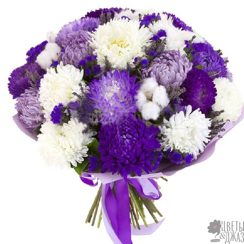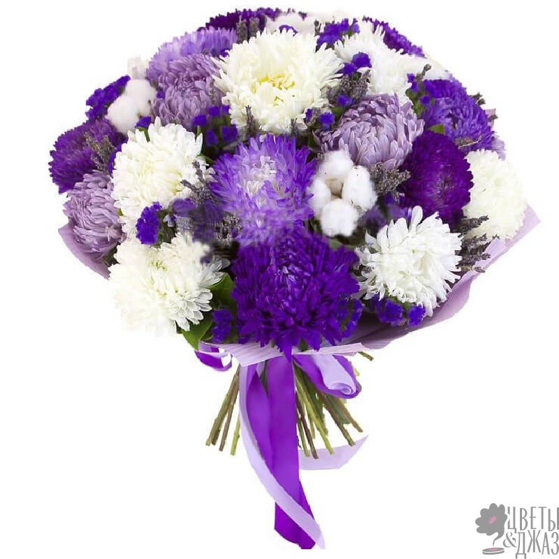 Букет состоит из MIX из 21 астры, 5 статица, хлопок, прозрачная упаковка, атласная лента.