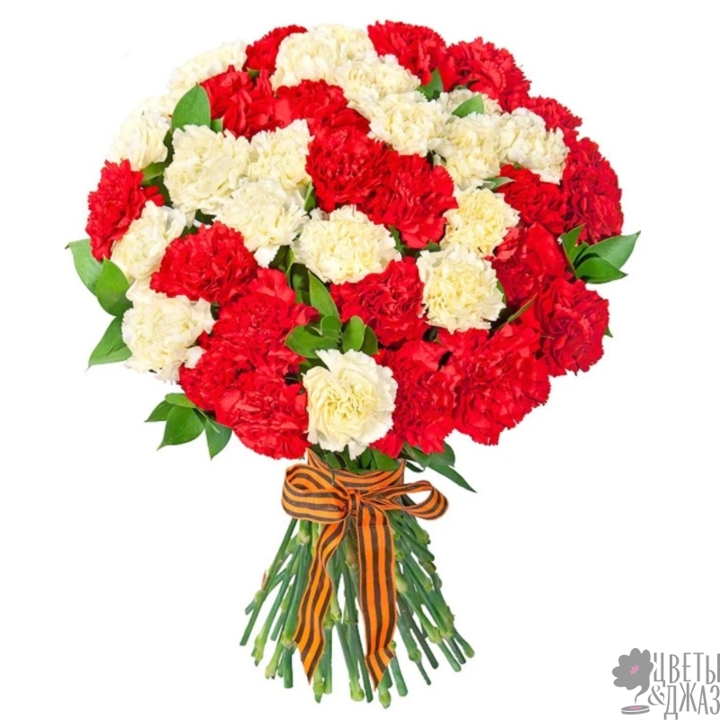 Букет состоит из 26 красных гвоздик, 25 белых гвоздик, зелень, прозрачная упаковка, лента.