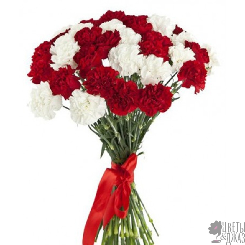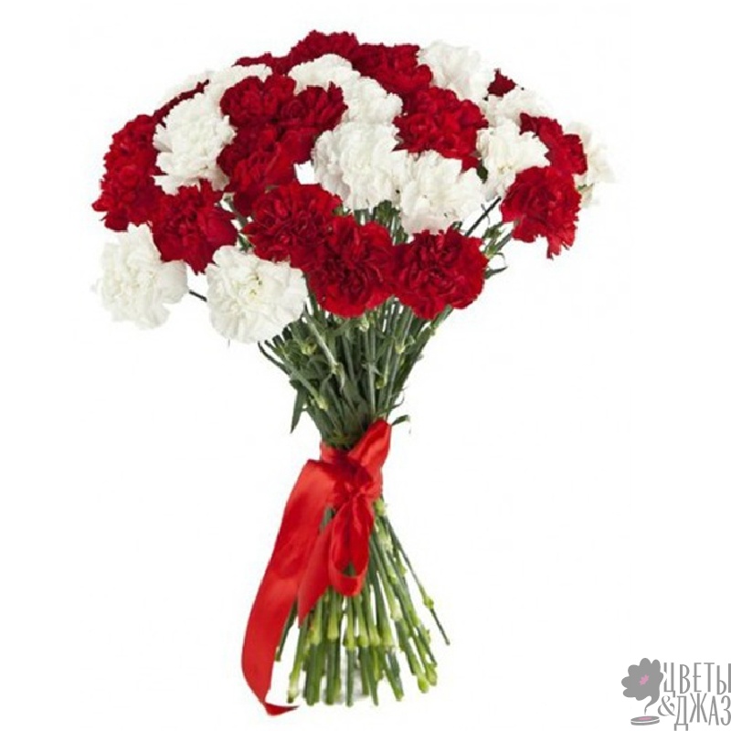 Букет состоит из 20 красных гвоздик, 20 белых гвоздик, прозрачная упаковка, лента.