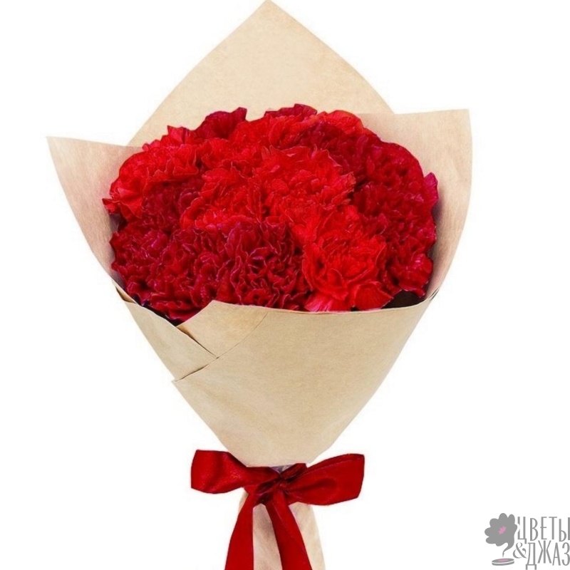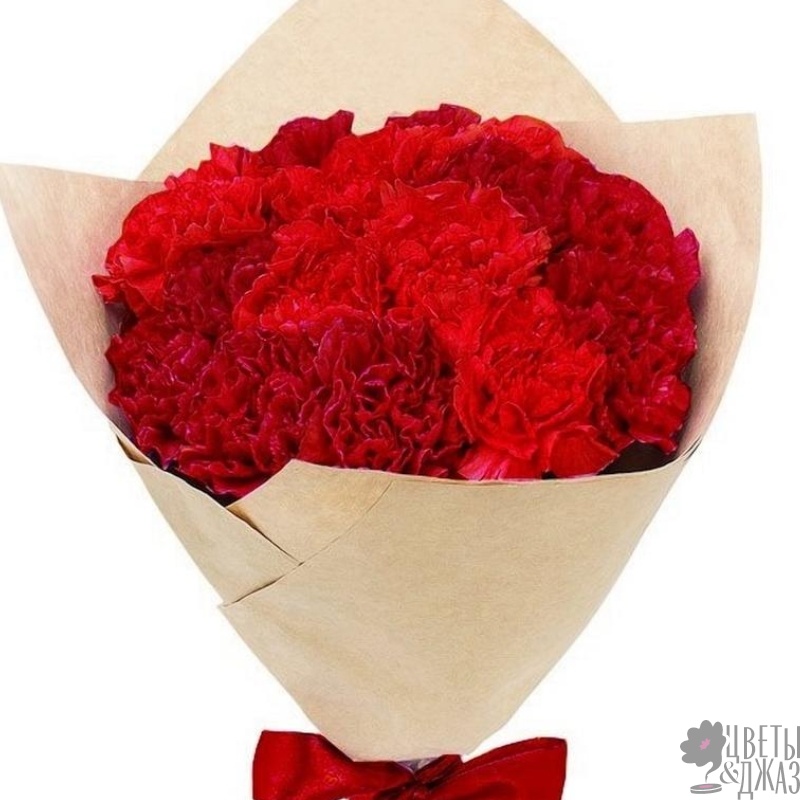 Букет состоит из 15 красных гвоздик , крафт, атласная лента.