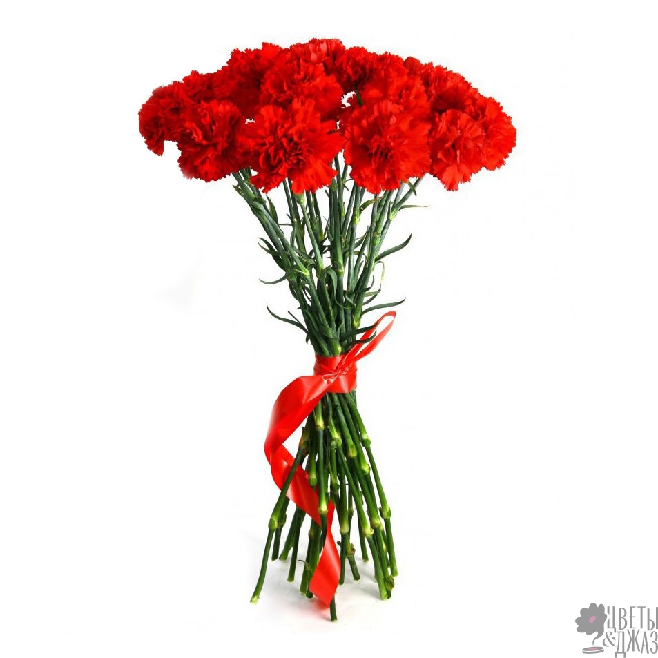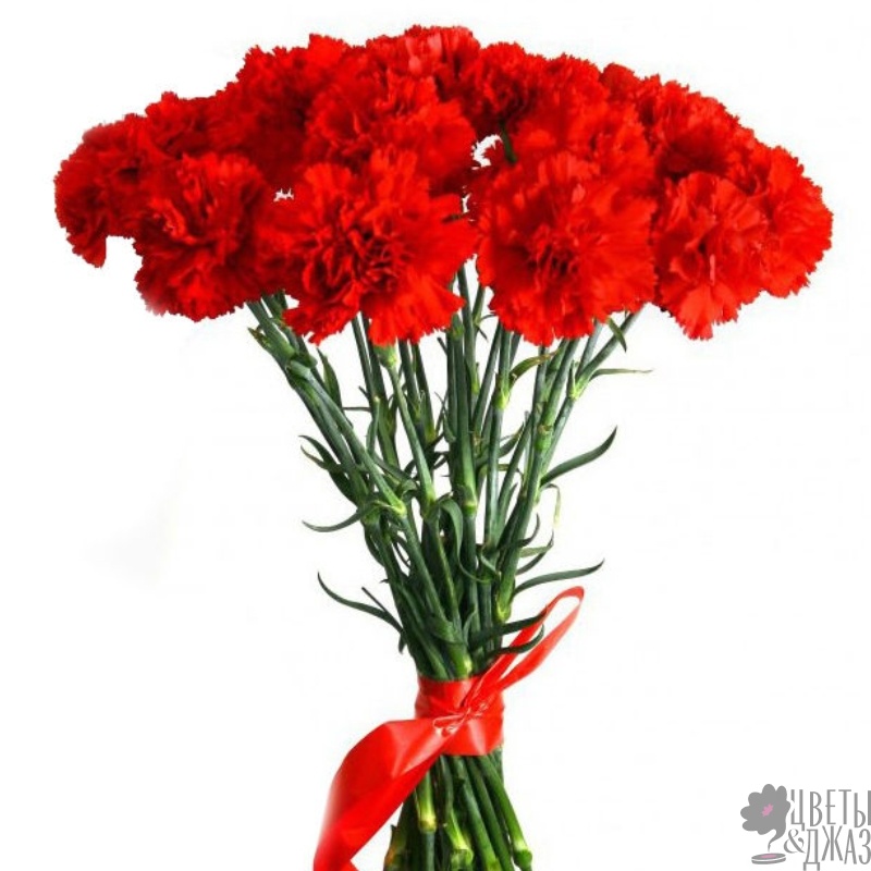 Букет состоит из 17 красных гвоздик, прозрачная упаковка, красная лента.
