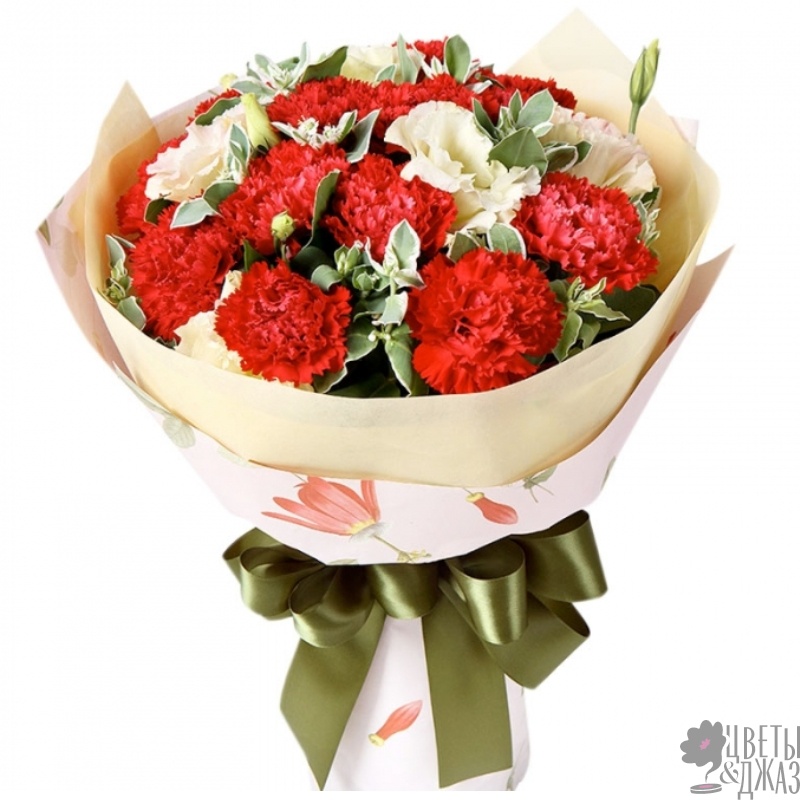 Букет состоит из 13 красных гвоздик, 5 белых эустом, зелень, красивая упаковка, атласная лента.
