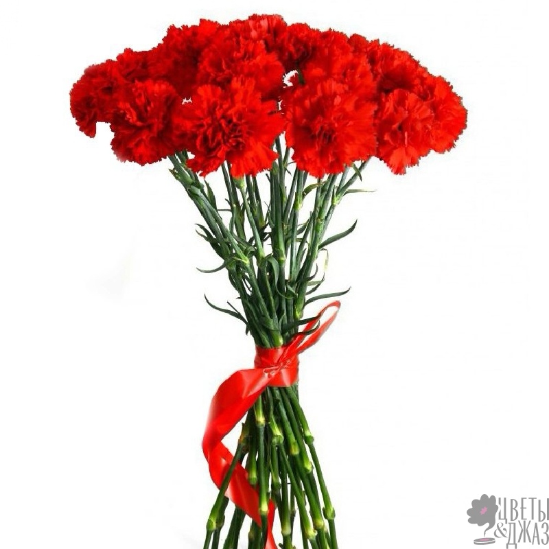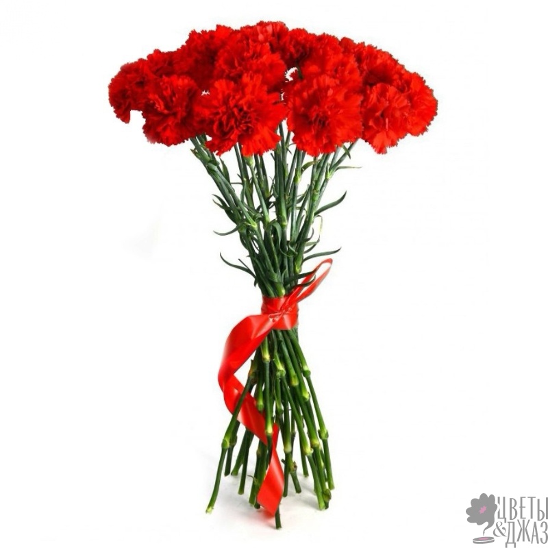 Букет состоит из 18 красных гвоздик, прозрачная упаковка, лента.
