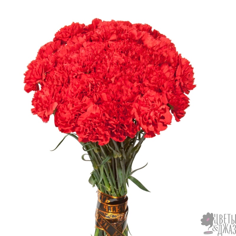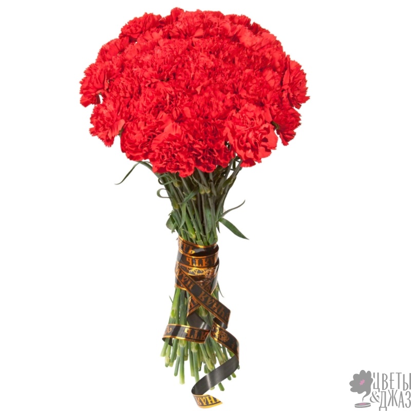 Букет состоит из 30 красных гвоздик, прозрачная упаковка, лента.