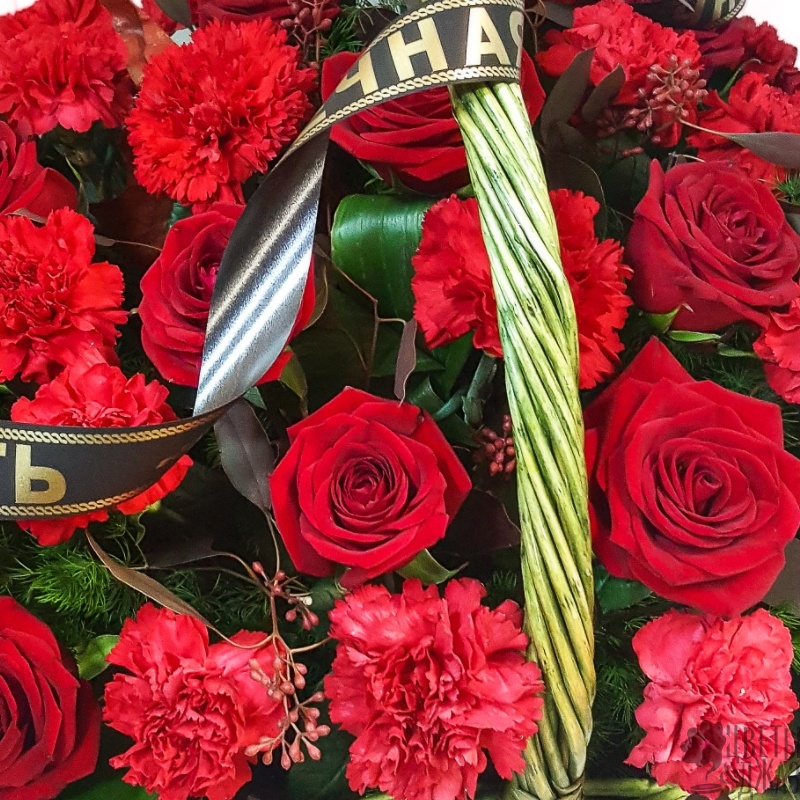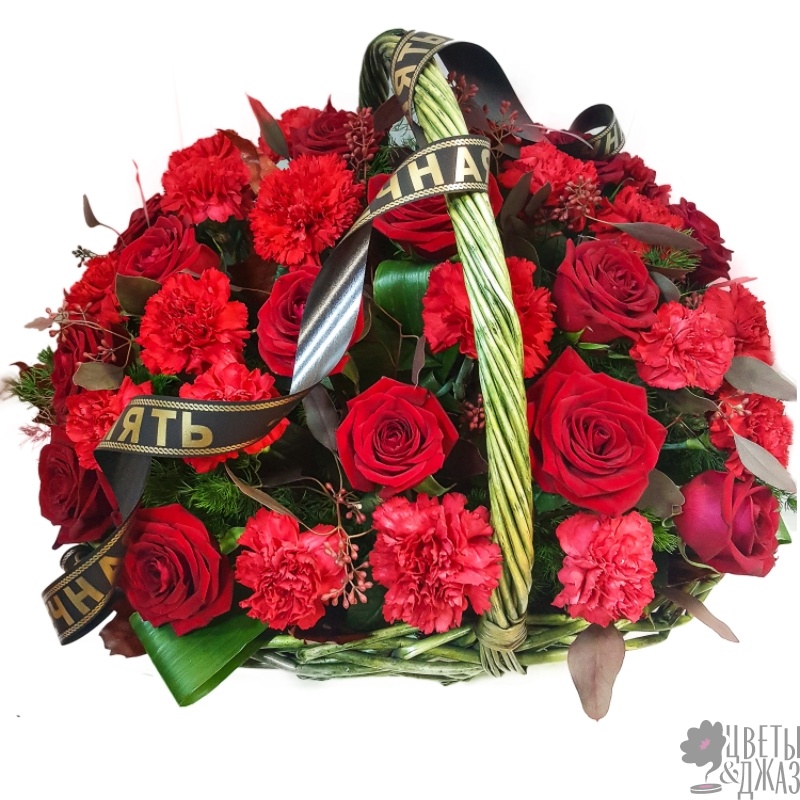 16 красных роз, 20 красных гвоздик, зелень, корзина, оазис, траурная лента.