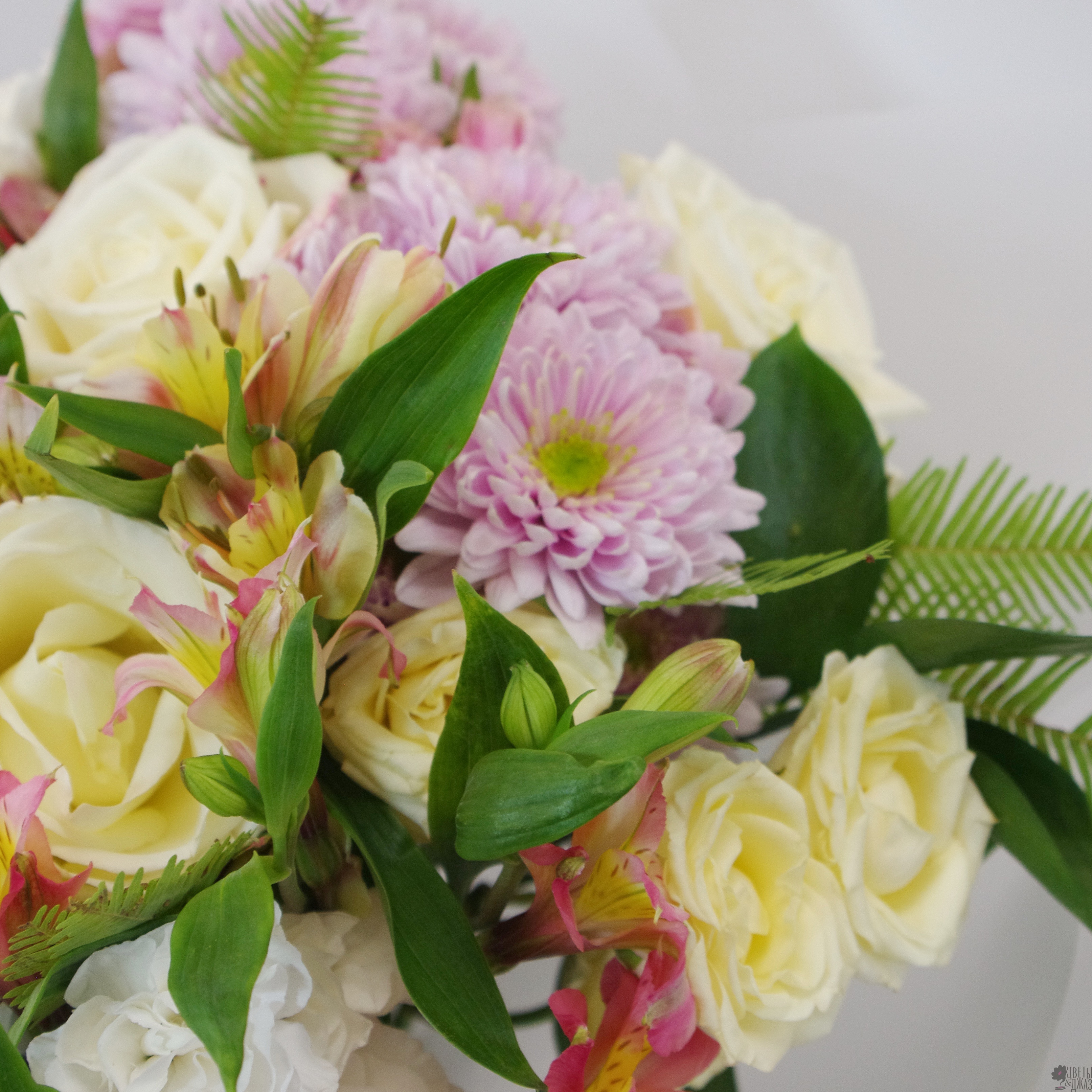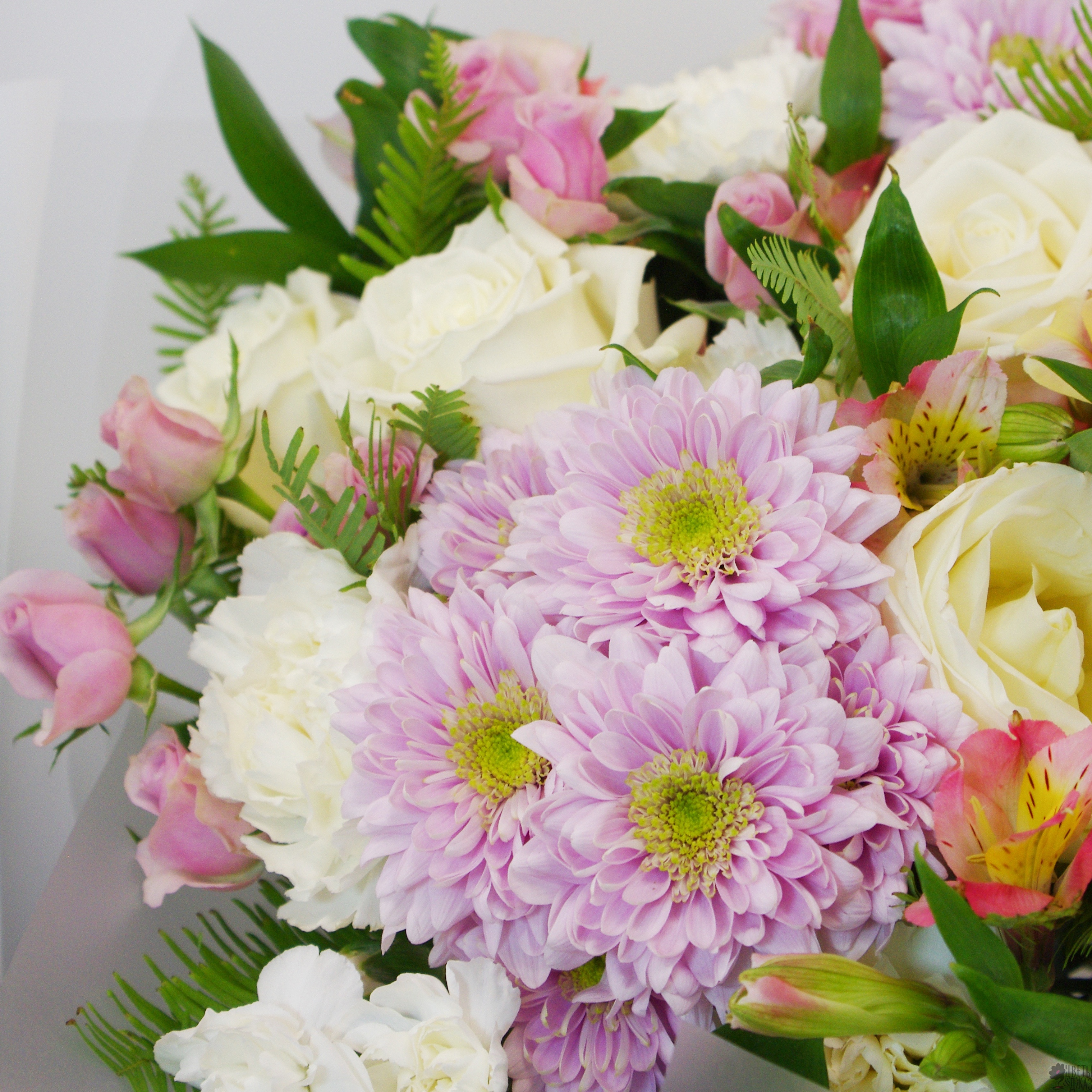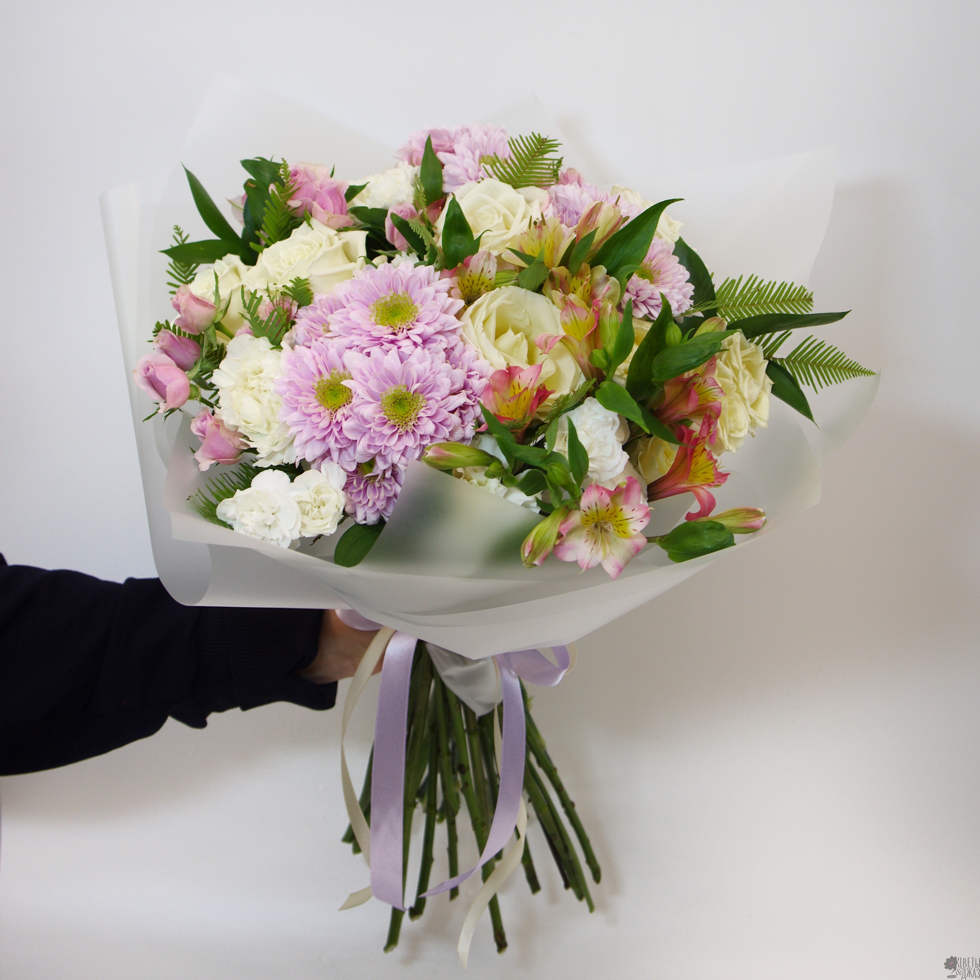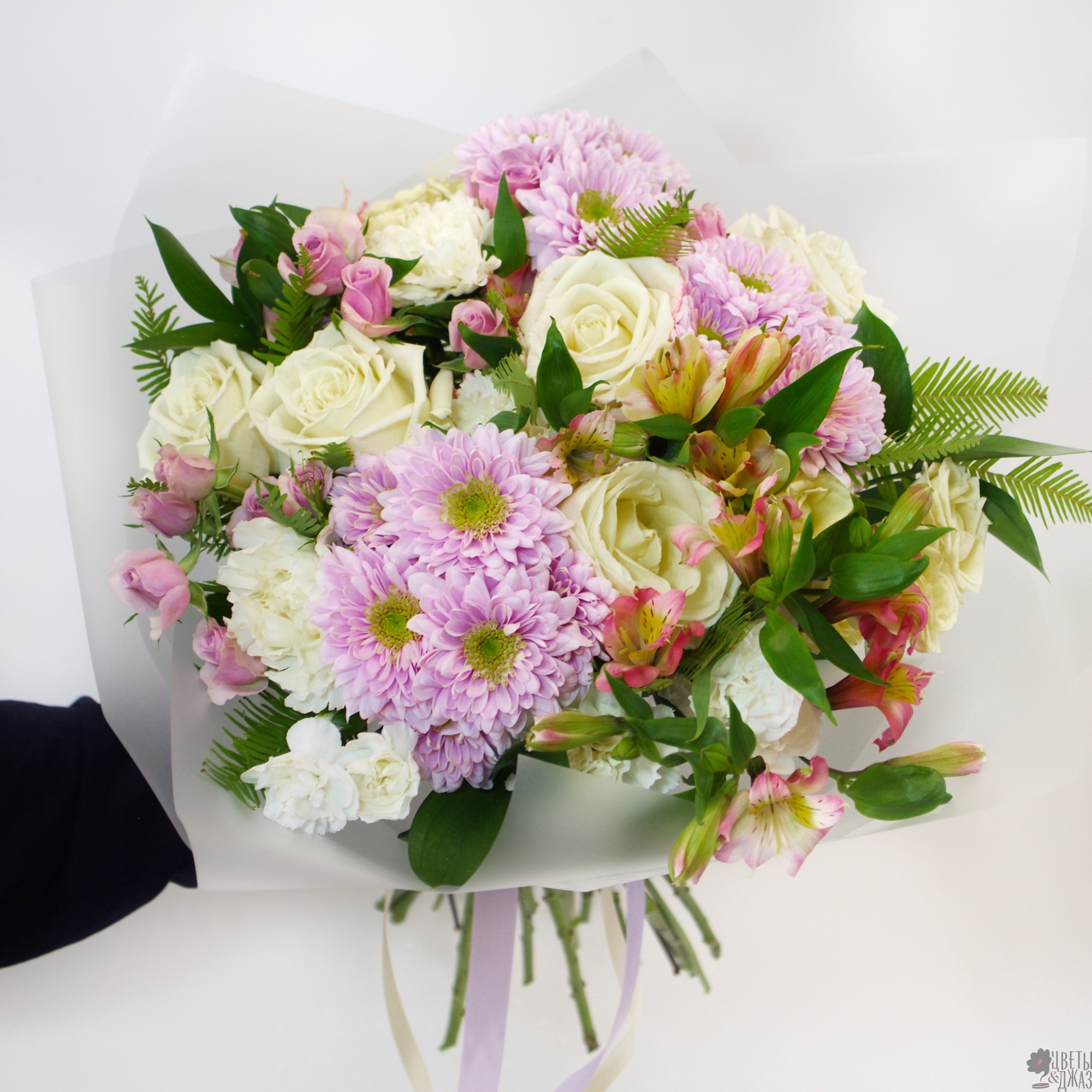 Альстромерия, Гвоздика, Гвоздика кустовая, Роза, Роза кустовая, Хризантема