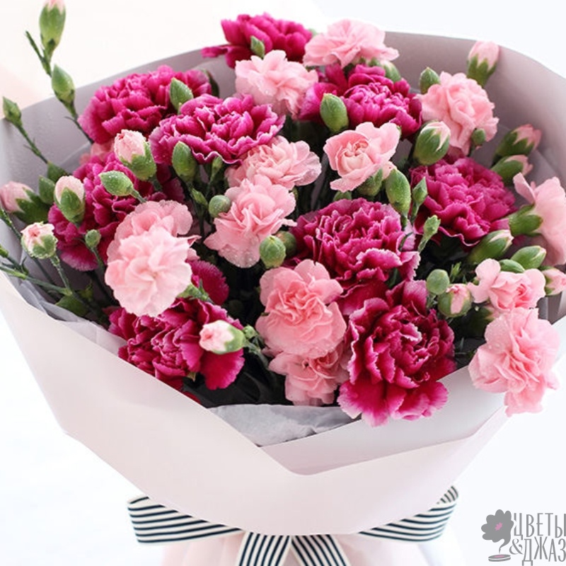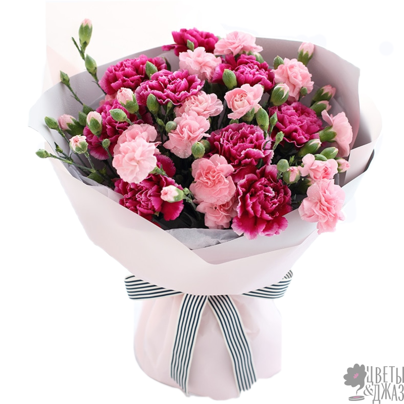 Букет состоит из 9 стеблей фиолетовой гвоздики, 10 веток розовой гвоздики, красивая упаковка, атласная лента.