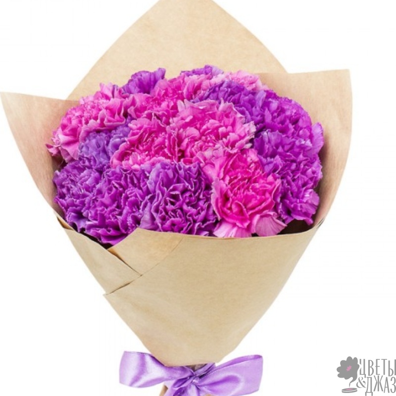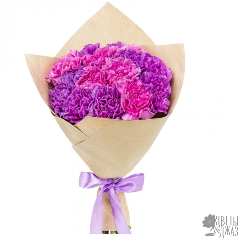 Букет состоит из 8 сиреневых гвоздик, 7 розовых гвоздик, крафт, атласная лента.