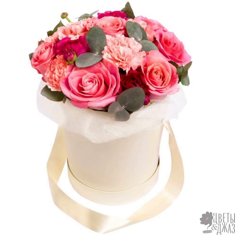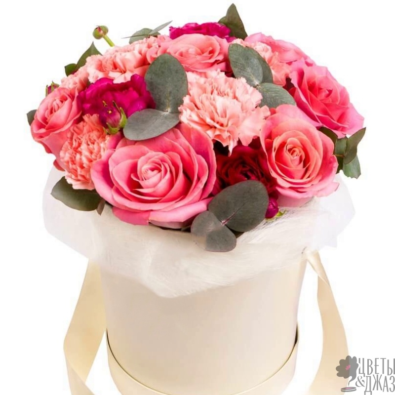 Букет состоит из 6 розовых роз, 5 розовых гвоздик, 2 красные розы, 1 ветка кустовой пионовидной розы, коробка, оазис.