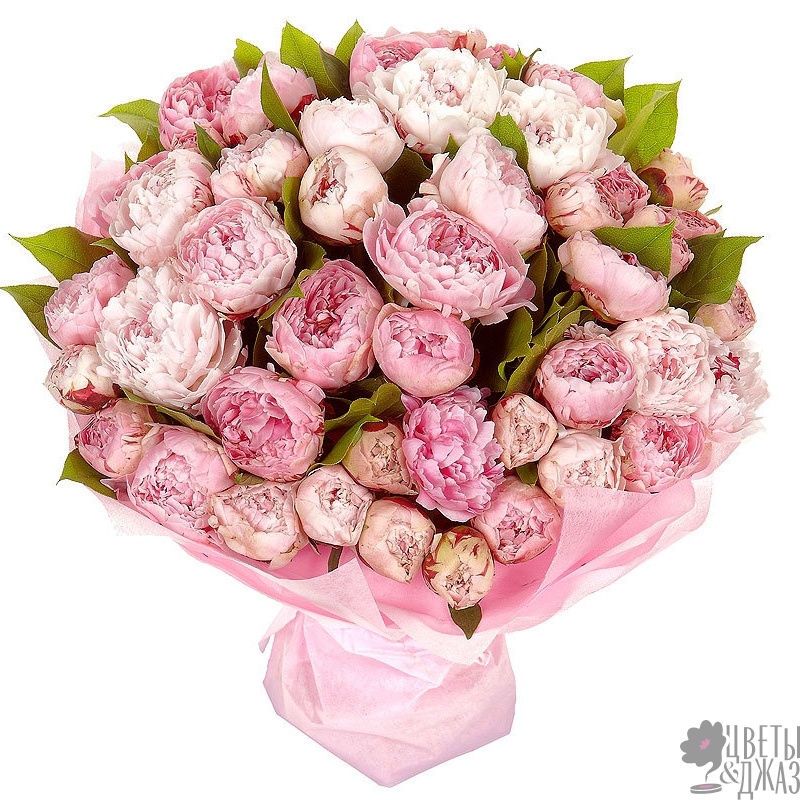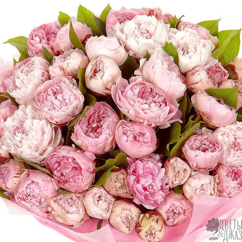 Букет состоит из 45 розовых пионов, зелень, красивая упаковка, атласная лента.