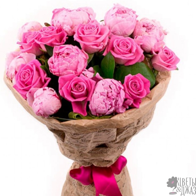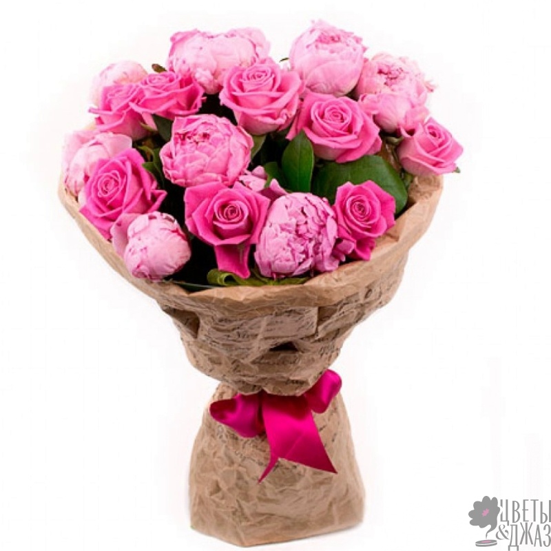 Букет состоит из 9 розовых роз, 8 пионов, зелень, крафт, атласная лента.