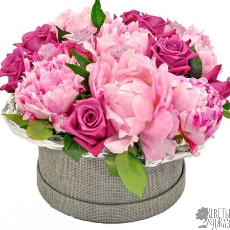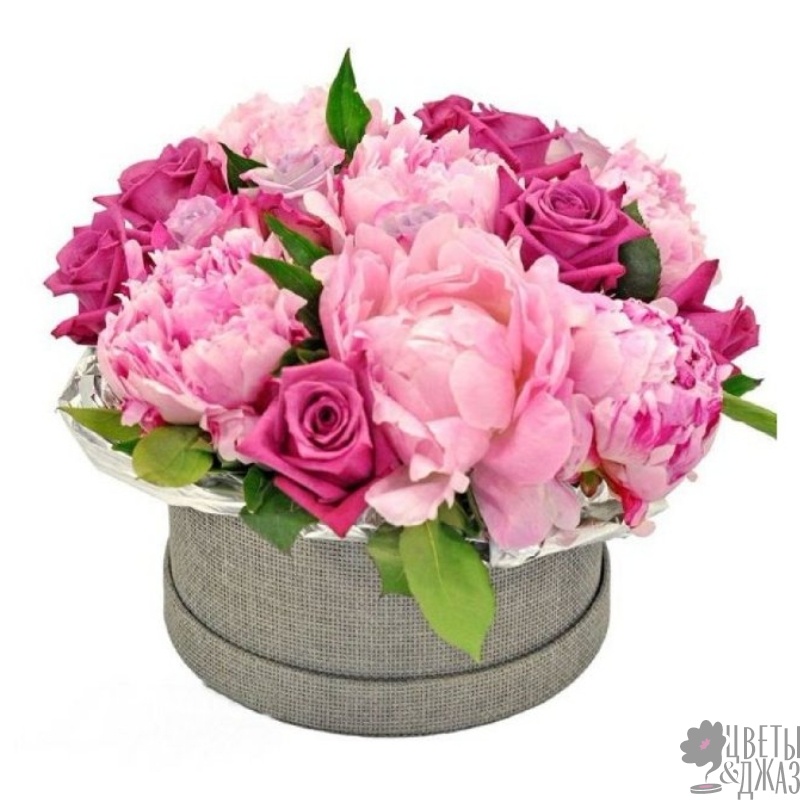 Букет состоит из 7 розовых пионов, 6 розовых роз, коробка.