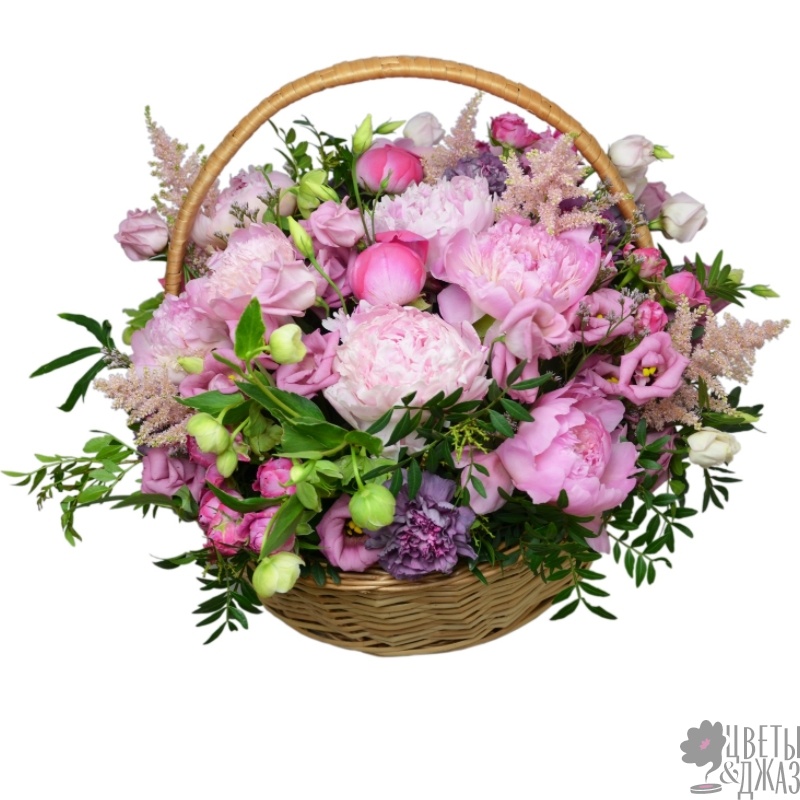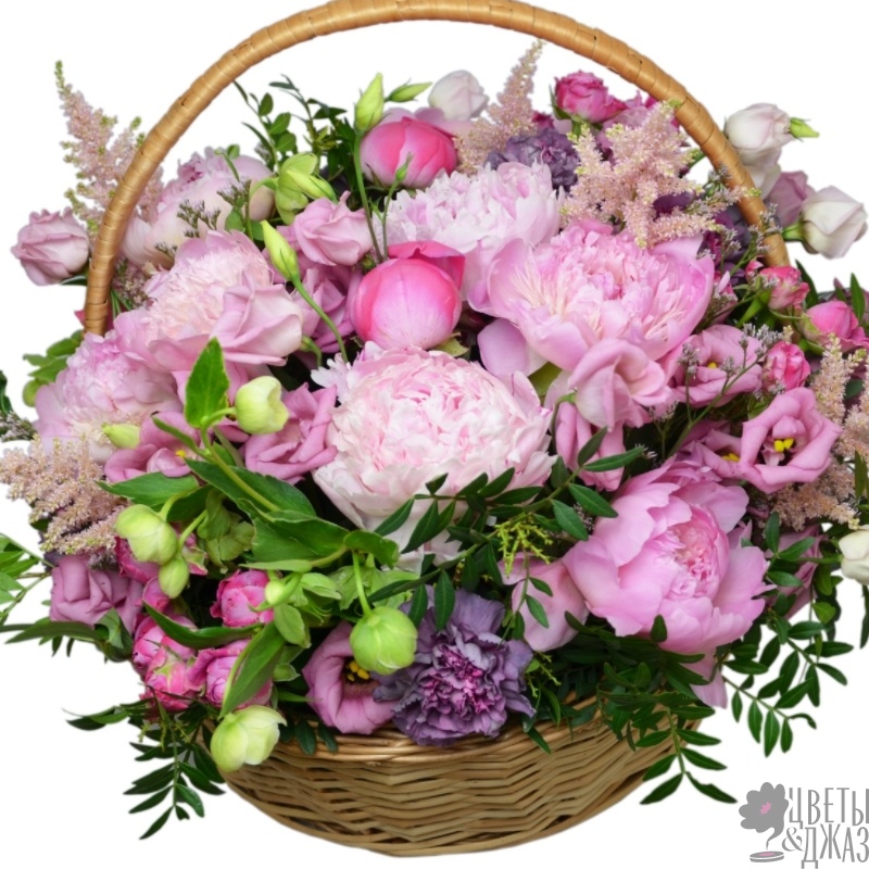 Букет состоит из 9 пионов, 6 пионовидных кустовых роз, 5 гвоздик, 7 веток эустомы, 7 астильба, зелень, корзина, оазис.