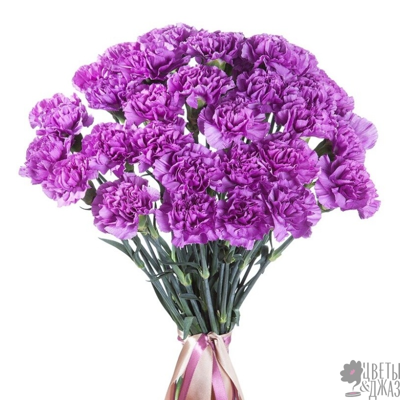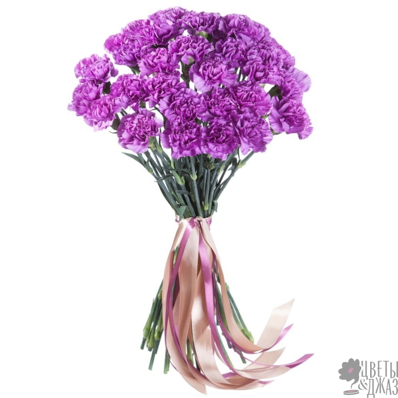 Букет состоит из 27 сиреневых гвоздик, прозрачная упаковка, атласная лента.