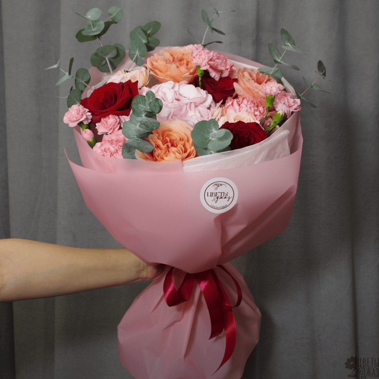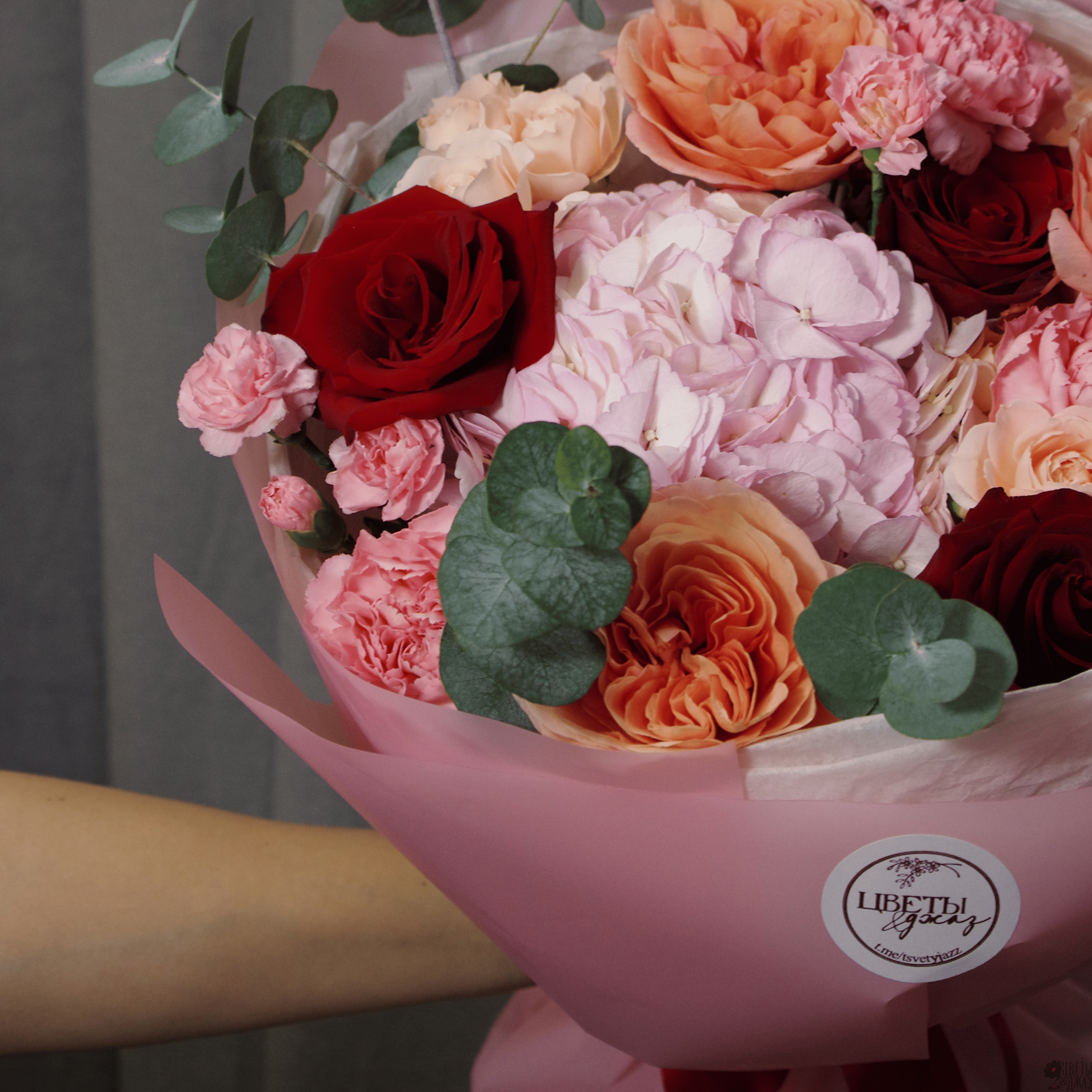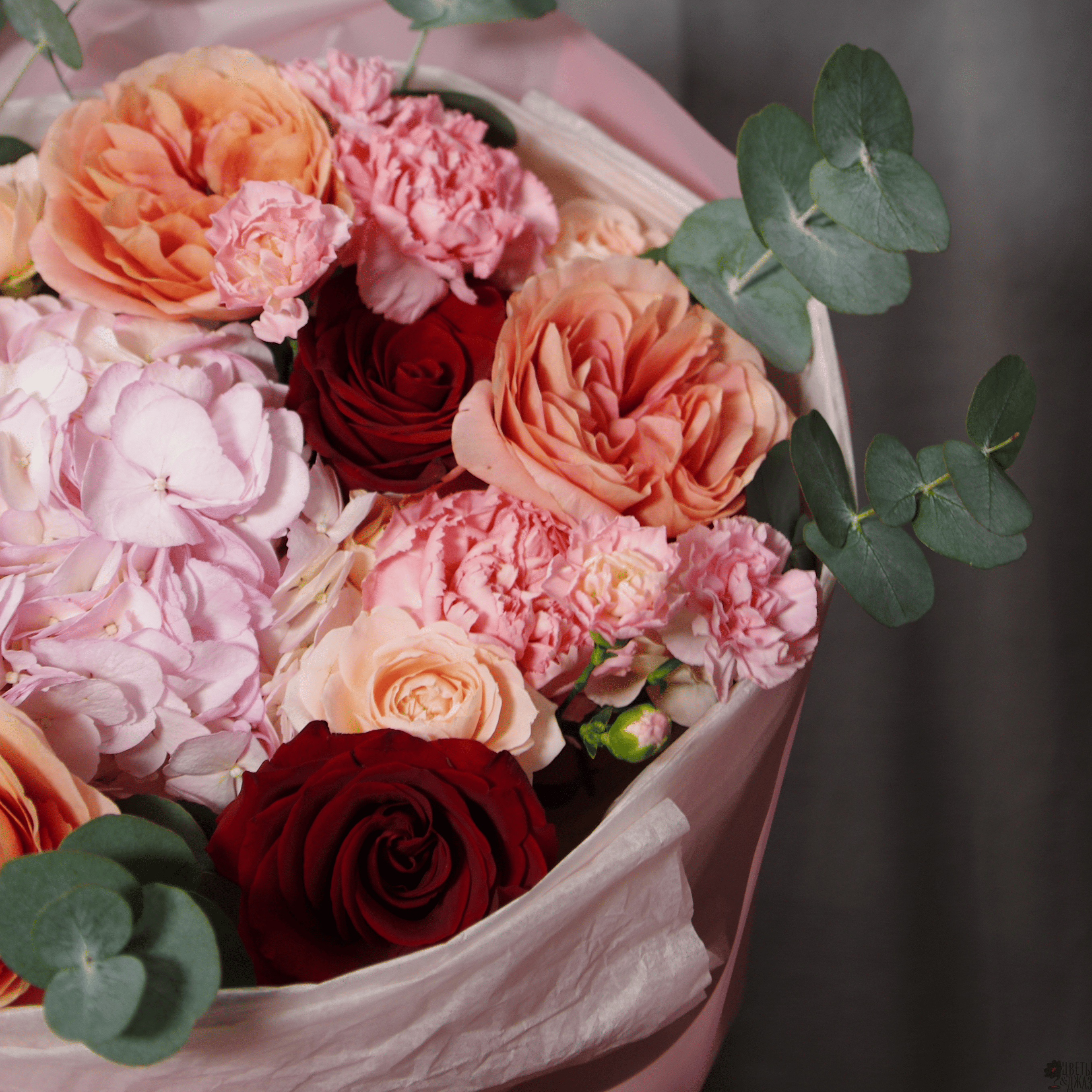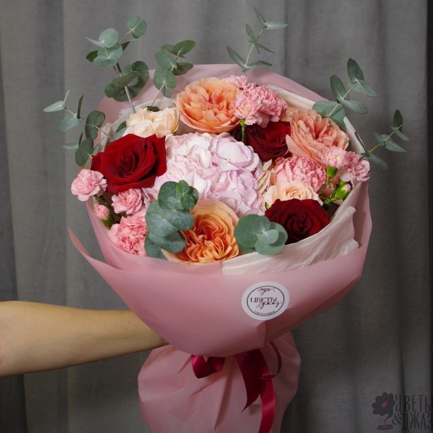 Гвоздика, Гвоздика кустовая, Гортензия, Роза, Роза кустовая, Роза пионовидная, Эвкалипт