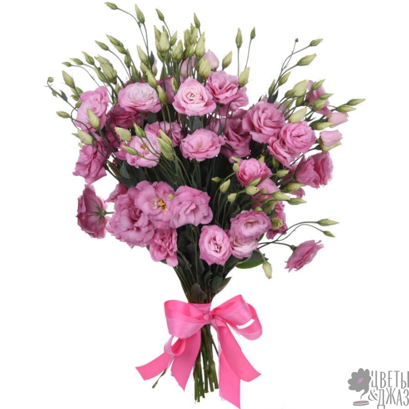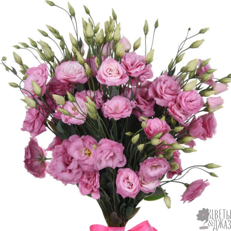 Букет состоит из 17 веток розовой эустомы, прозрачная упаковка, атласная лента.