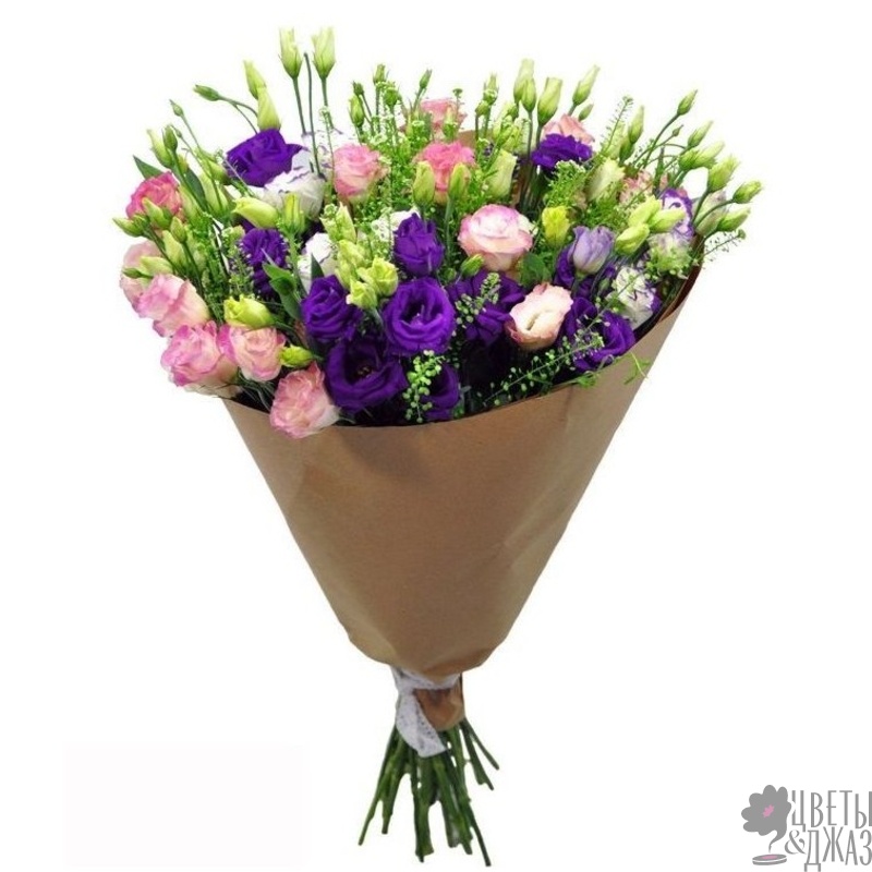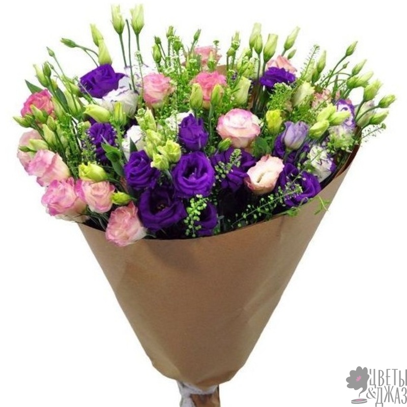 Букет состоит из 21 ветка разноцветной эустомы, зелень, крафт, атласная лента.