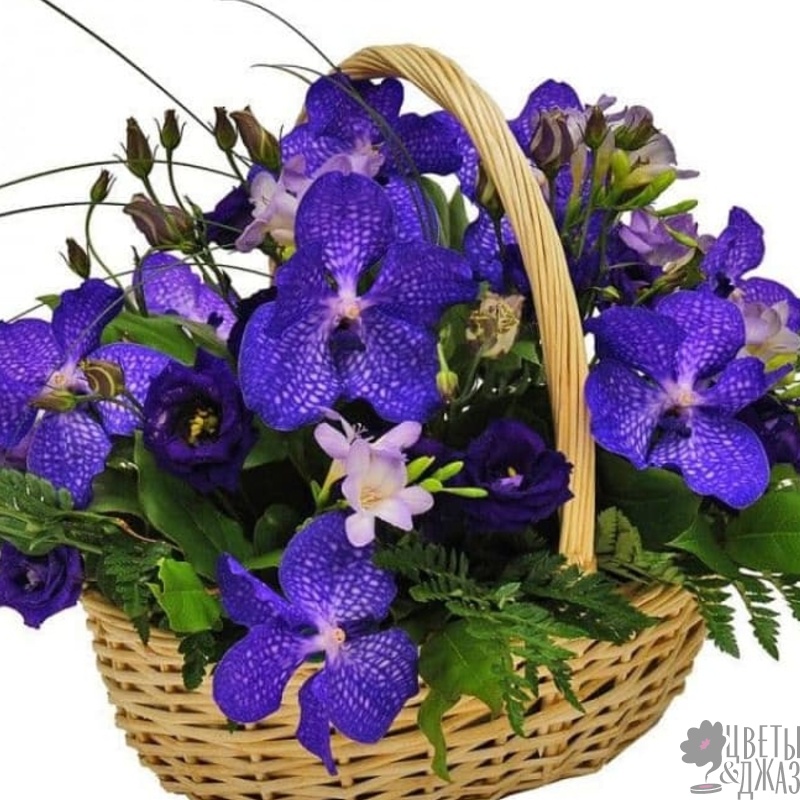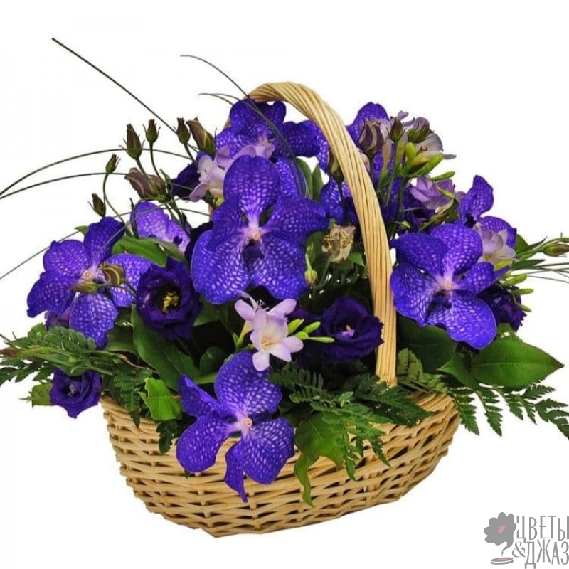Букет состоит из 7 орхидей, 4 ветки эустомы, 4 фрезии, зелень, корзина, оазис.