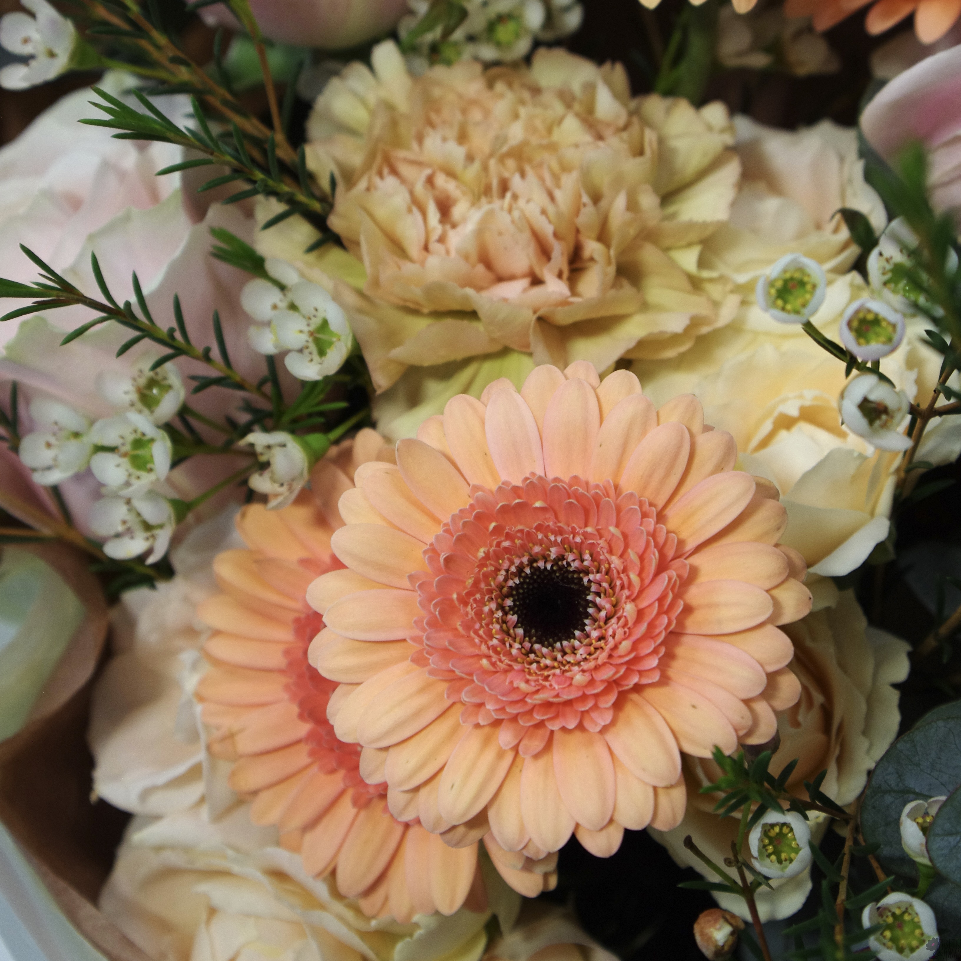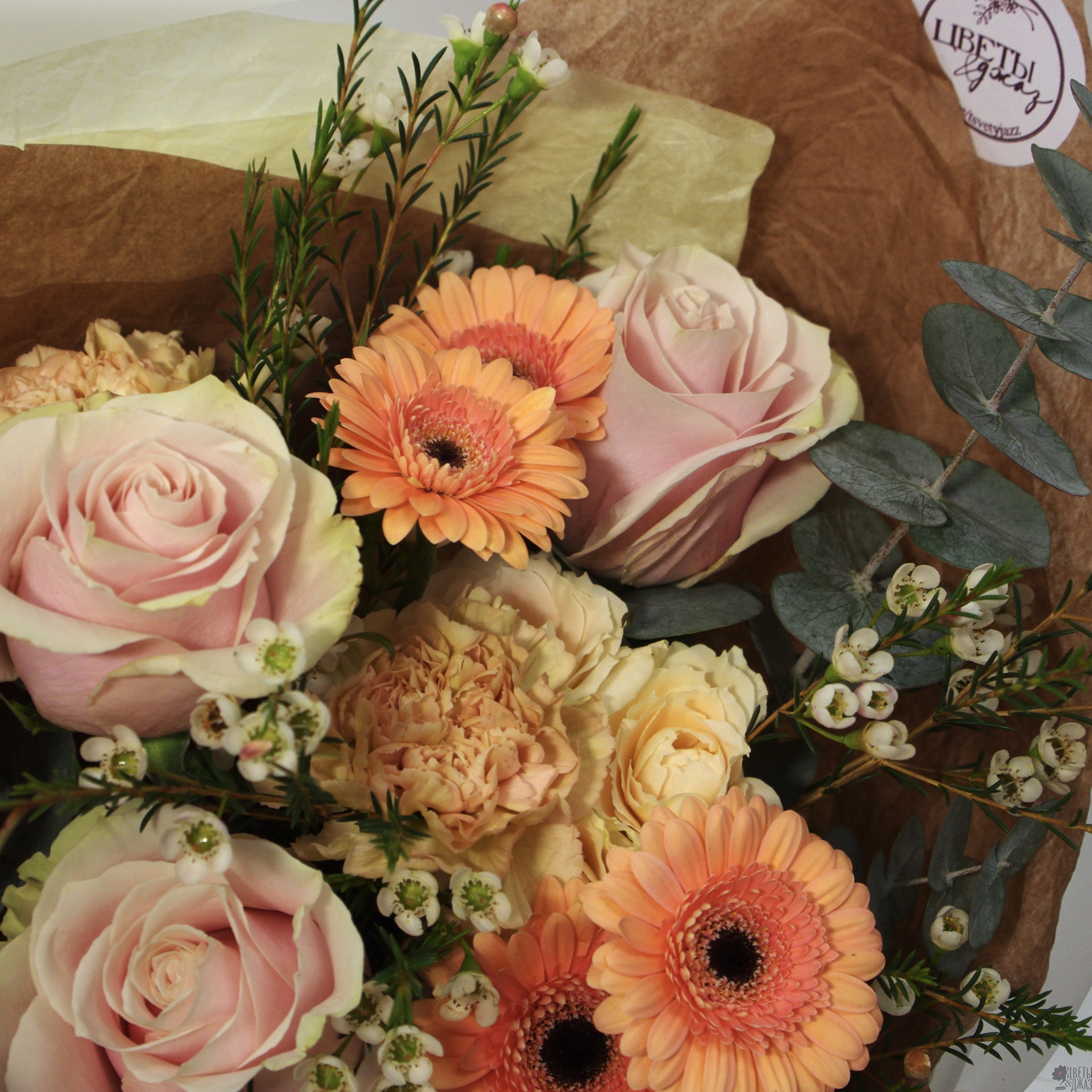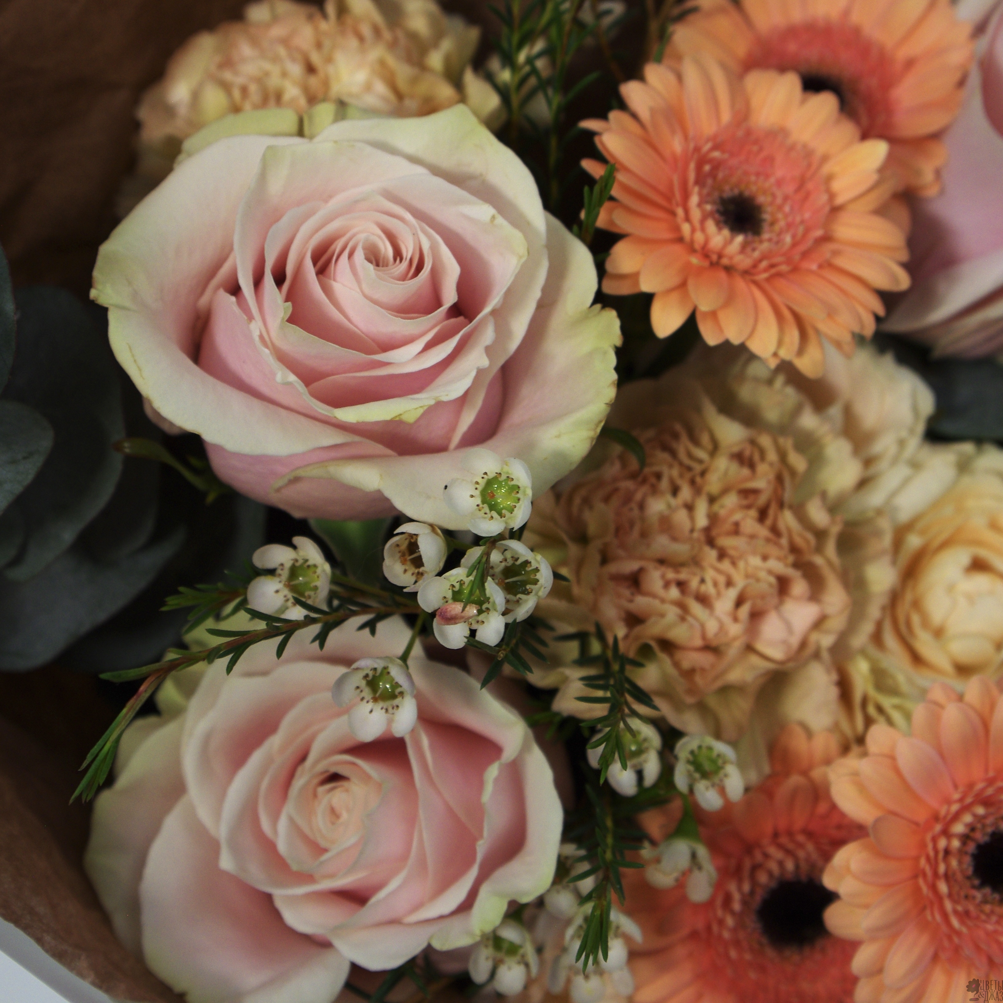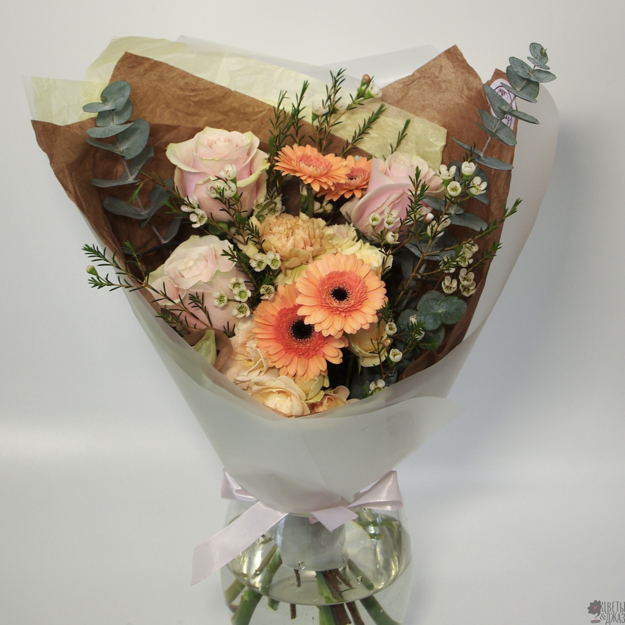 Гвоздика 2 шт., Гербера 5 шт., Роза 3 шт., Роза кустовая 2 шт., Хамелациум 2 шт.