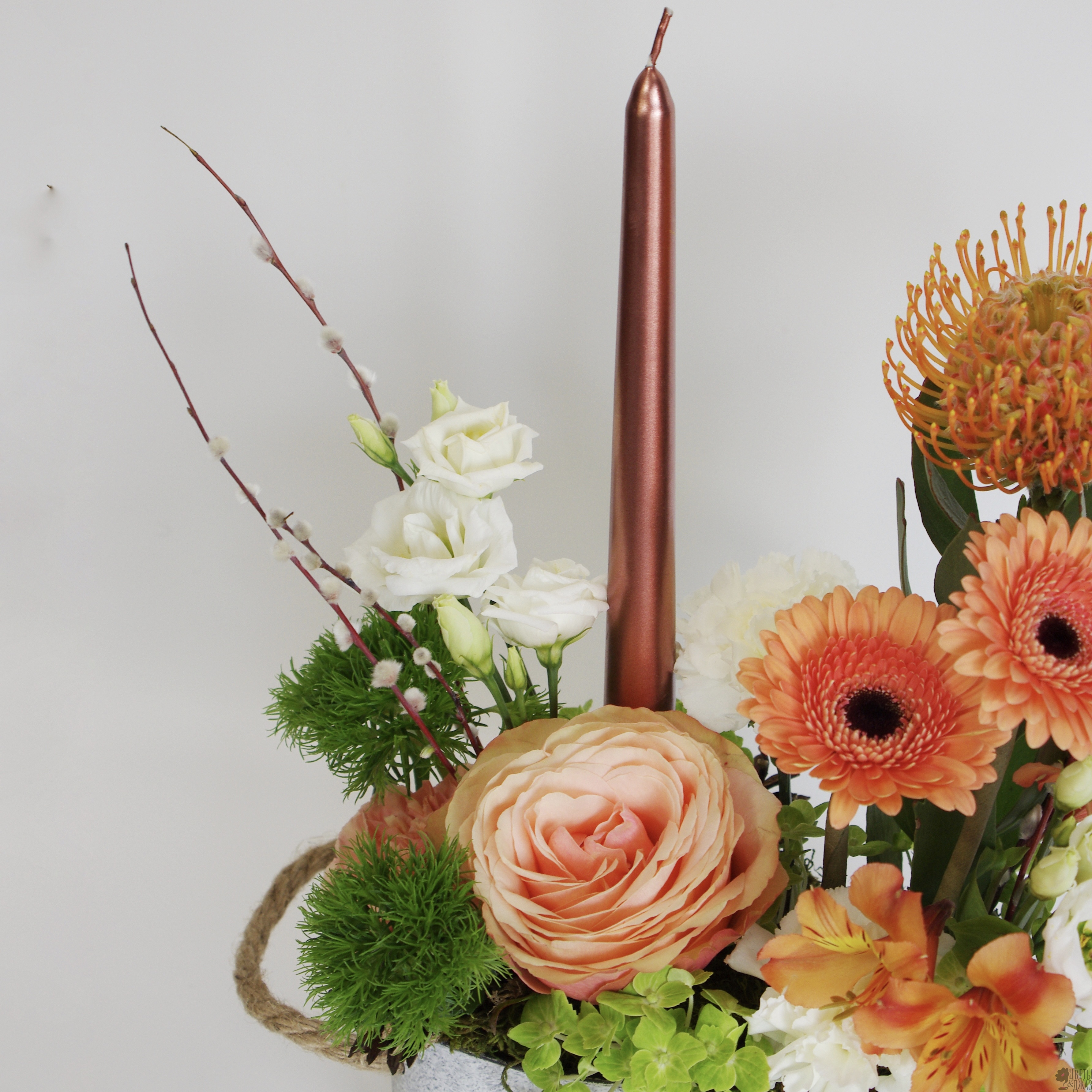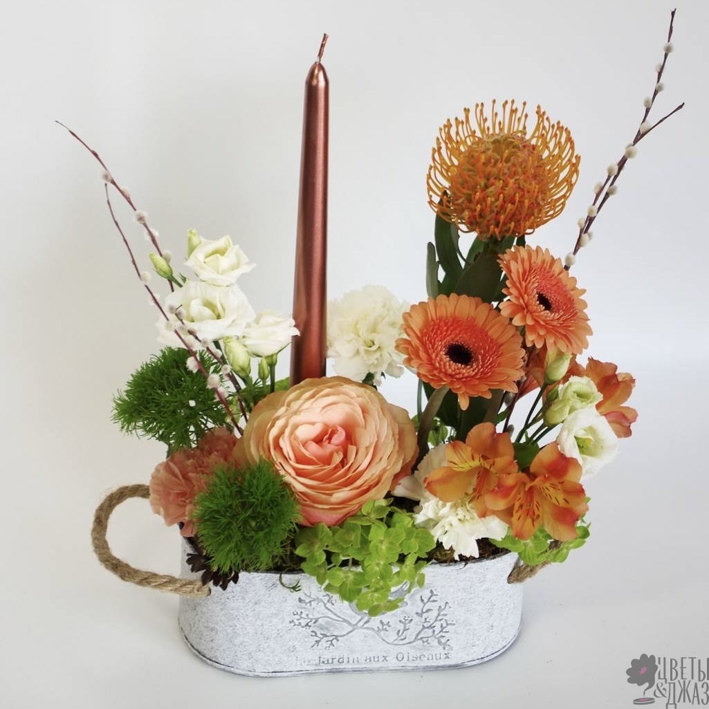 Кашпо с пасхальной композицией с герберами и розой