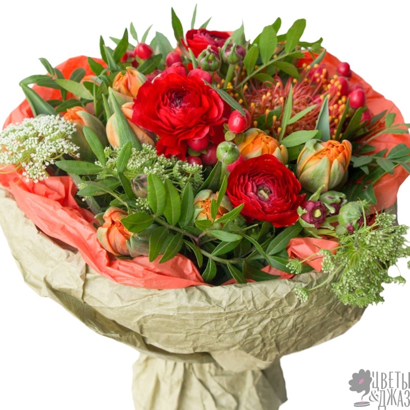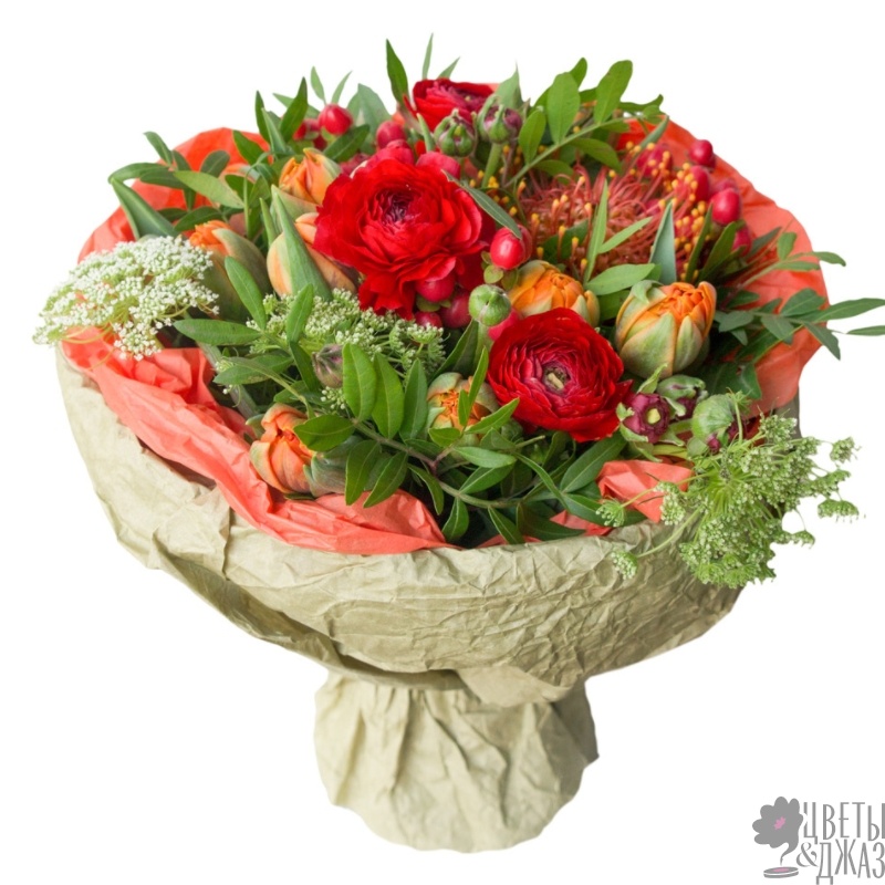 Букет состоит из 3 ранункулюса, 9 тюльпанов, 3 ветки гиперикума, 5 амми, 1 леукоспермум, зелень, крафт, атласная лента.