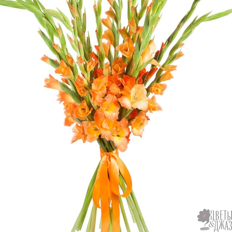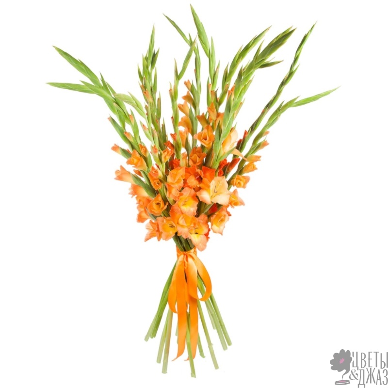 Букет состоит из 15 оранжевых гладиолусов, прозрачная упаковка, атласная лента.
