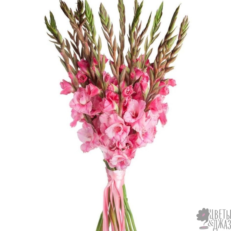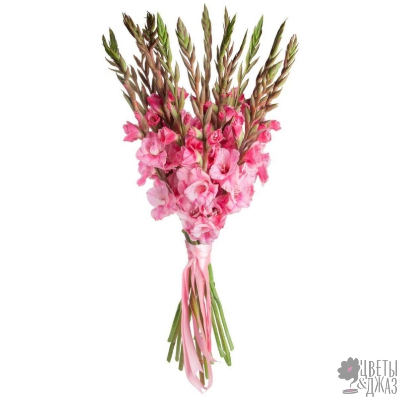 Букет состоит из 15 розовых гладиолусов, прозрачная упаковка, атласная лента.