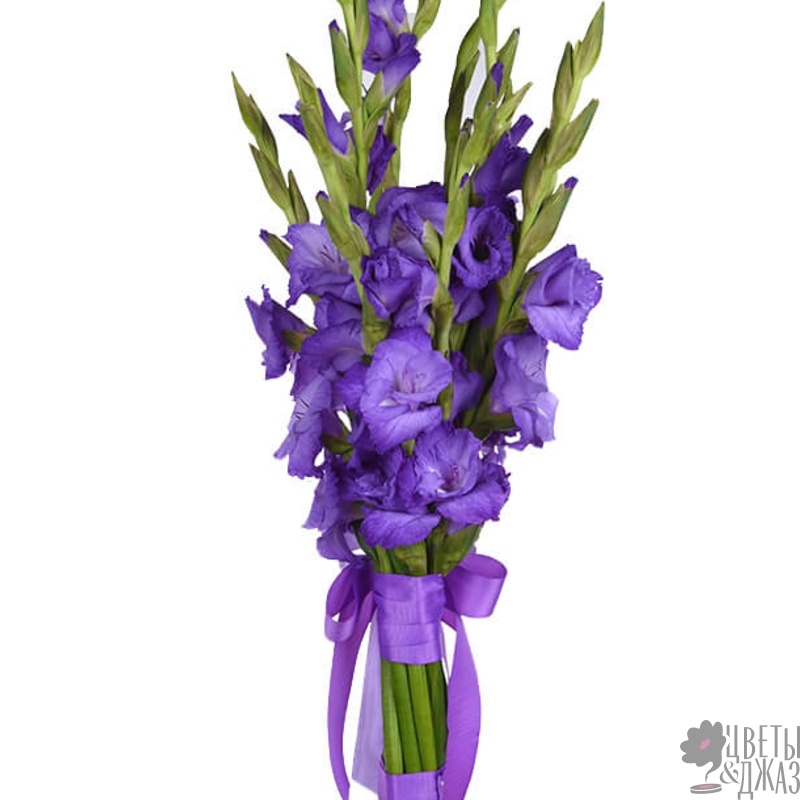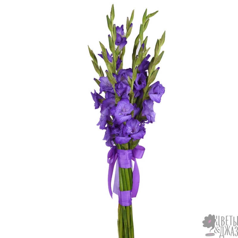 Букет состоит из 9 сиреневых гладиолусов, прозрачная упаковка, атласная лента.
