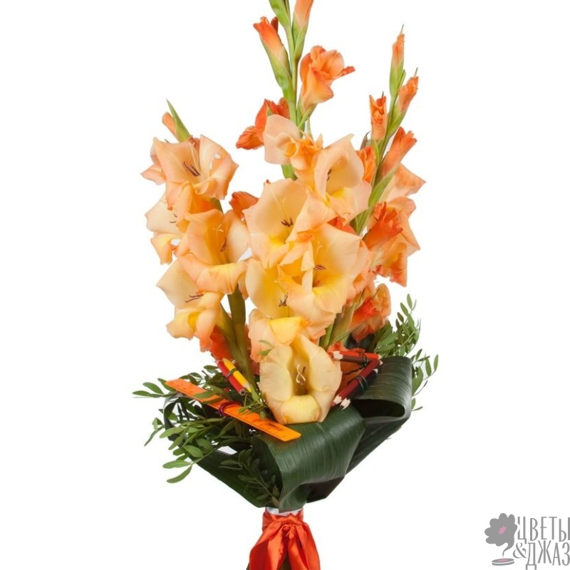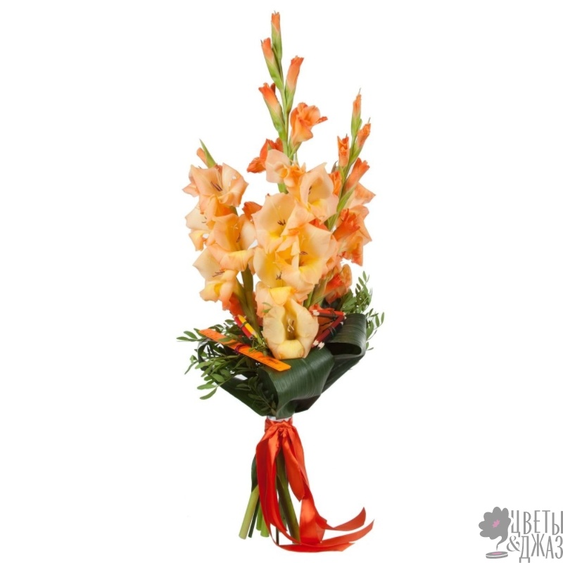Букет состоит из 7 оранжевых гладиолусов, аспидистра, зелень, прозрачная упаковка, атласная лента.