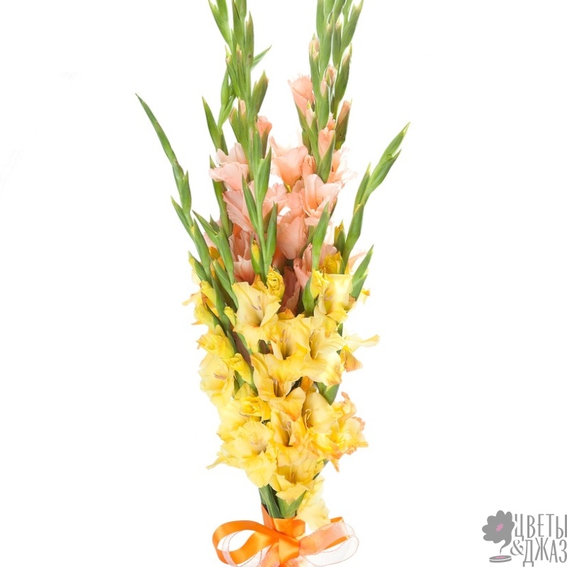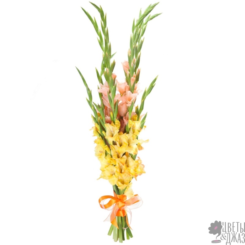 Букет состоит из MIX из 11 гладиолусов, прозрачная упаковка, атласная лента.