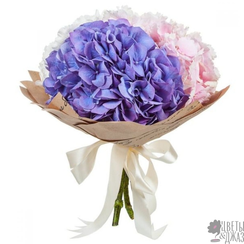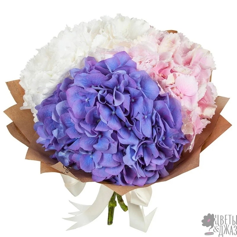 Букет состоит из 3 гортензии, крафт, атласная лента.