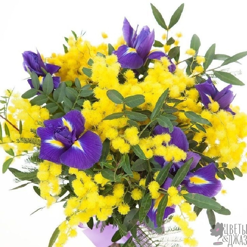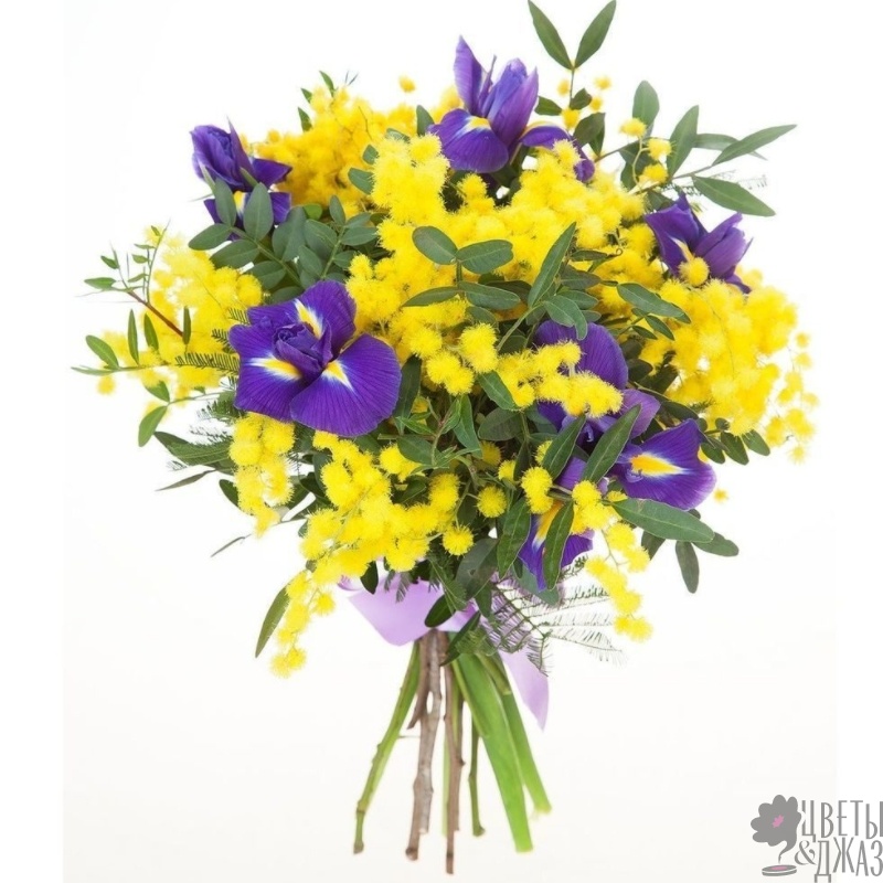 Букет состоит из 7 ирисов, 4 ветки мимозы, зелень, прозрачная упаковка, атласная лента.