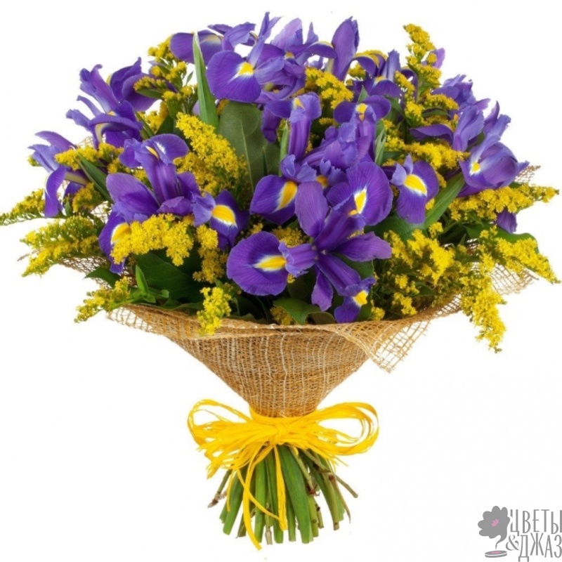 Букет состоит из 25 ирисов, 10 веток мимозы, красивая упаковка, атласная лента.