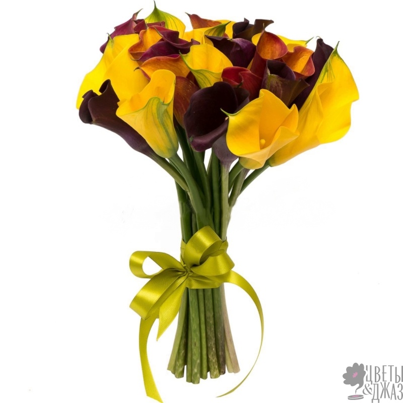 Букет состоит из MIX из 25 желтых и бордовых калл, прозрачная упаковка, атласная лента.