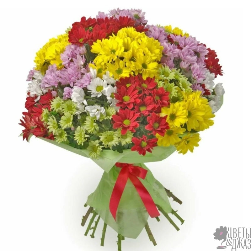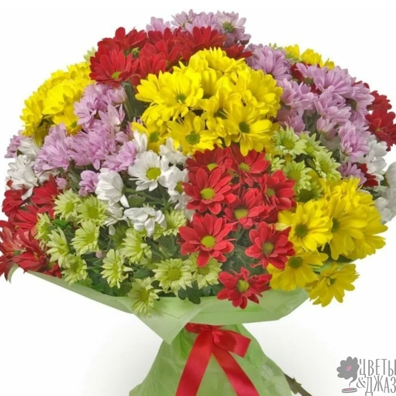 Букет состоит из 5 зеленых хризантем, 5 белых хризантем, 5 желтых хризантем, 5 розовых хризантем, 5 красных хризантем, красивая упаковка, атласная лента.