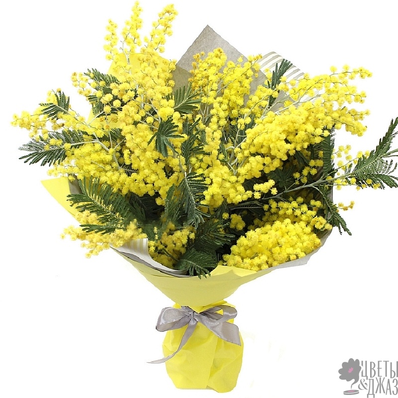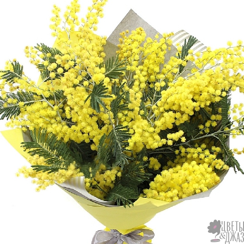Букет состоит из 7 веток мимозы, крафт, атласная лента.