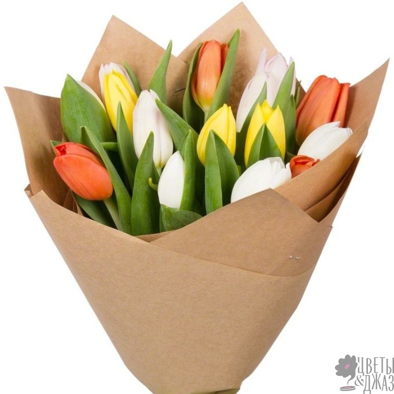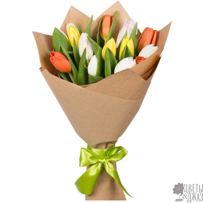 Букет состоит из MIX из 15 тюльпанов, крафт, атласная лента.