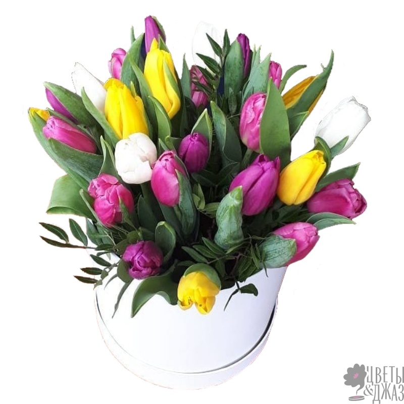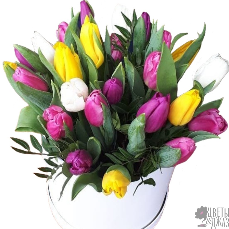 Букет состоит из MIX из 25 тюльпанов, коробка, оазис.