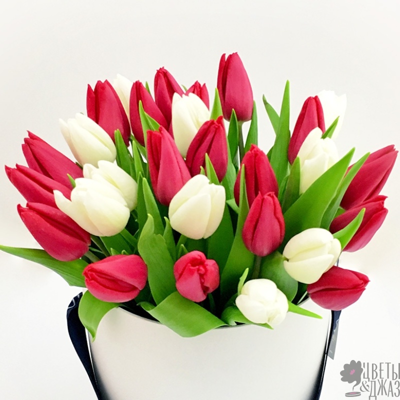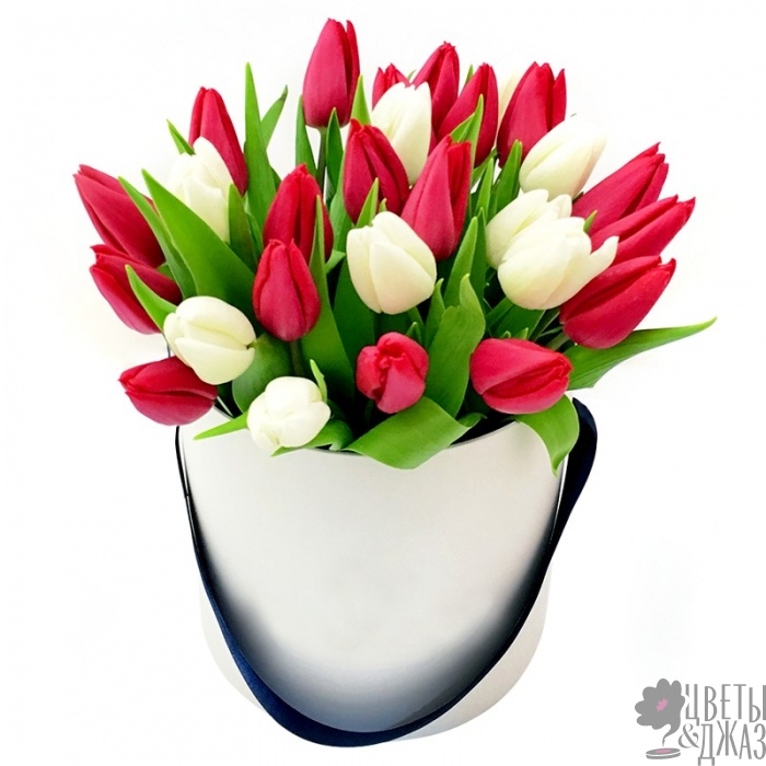 MIX из 27 белых и красных тюльпанов, коробка, оазис.