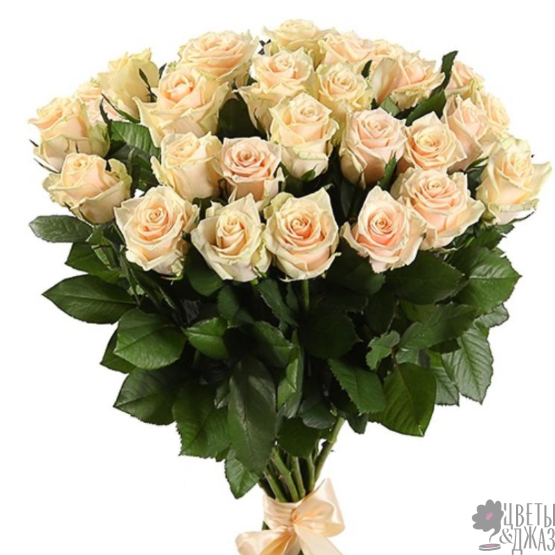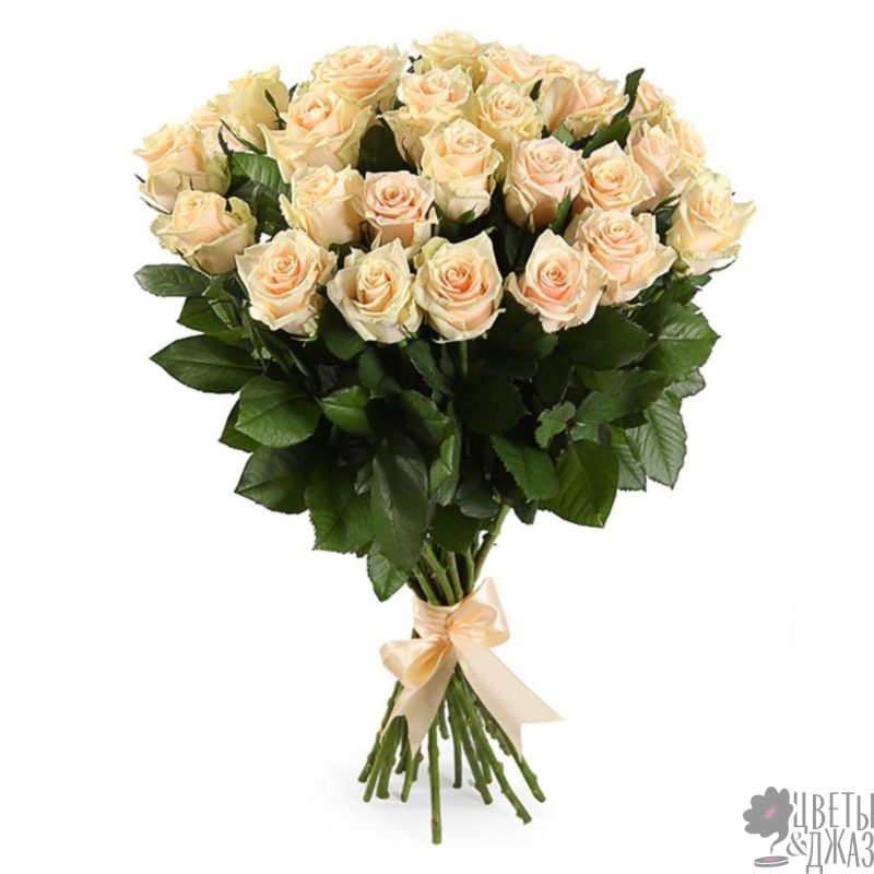 Букет состоит из 29 кремовых роз, прозрачная упаковка, атласная лента.