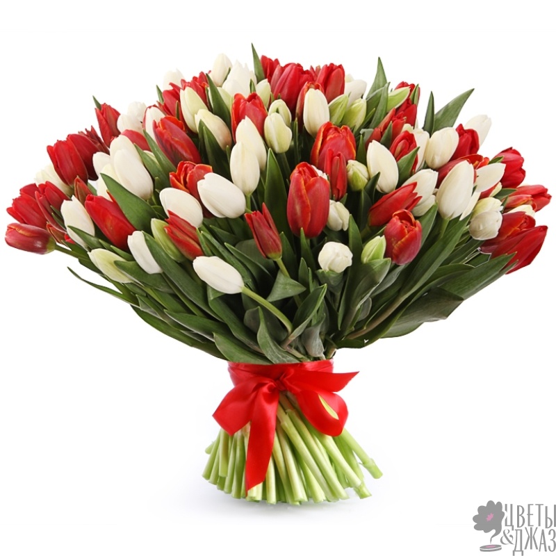 Букет состоит из 51 красный тюльпан, 50 белых тюльпанов, красная лента.