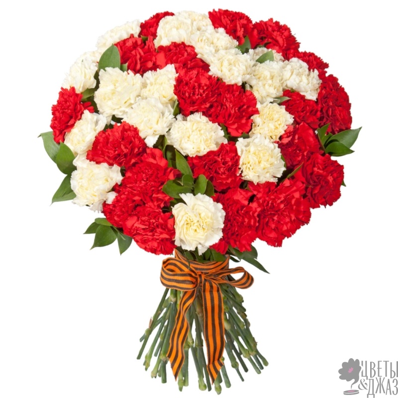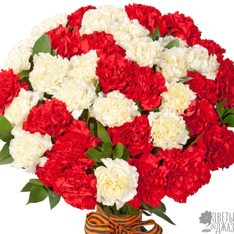 Букет состоит из 25 белых гвоздик, 25 красных гвоздик, прозрачная упаковка, лента.