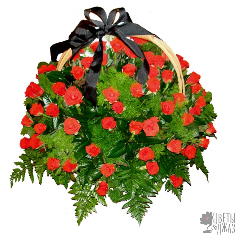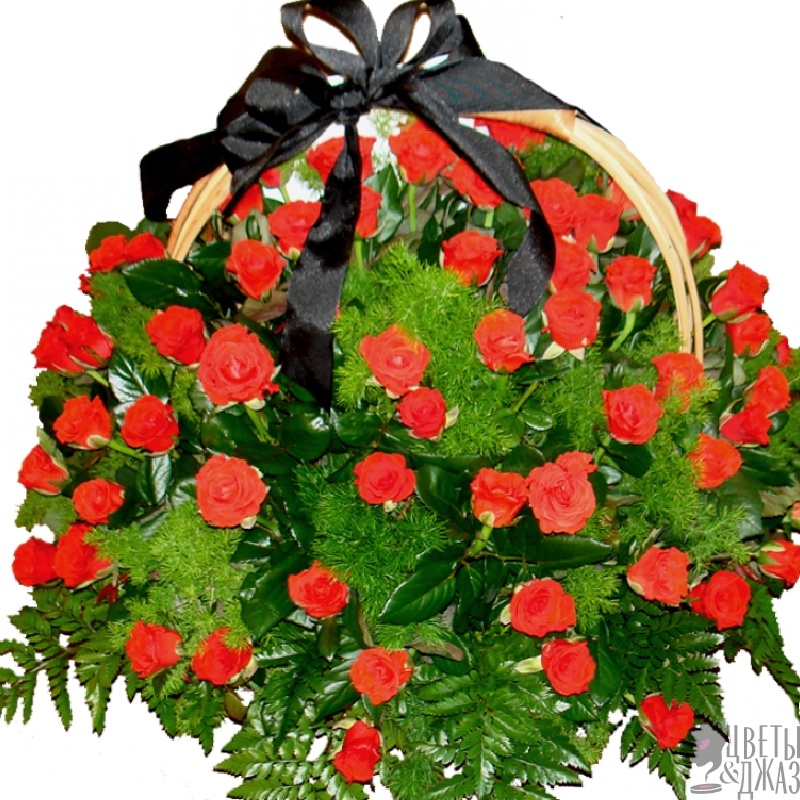 60 красных роз, зелень, корзина, оазис, траурная лента.