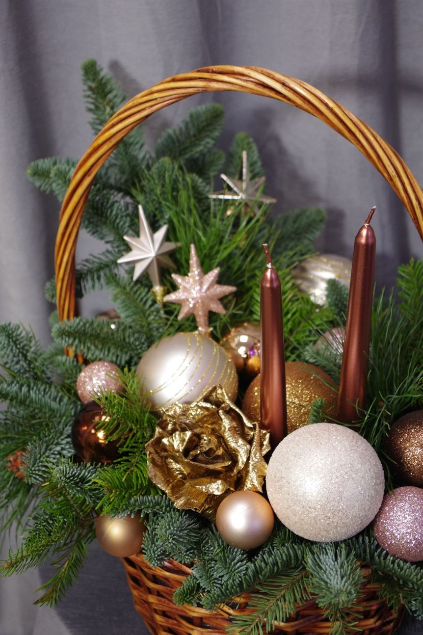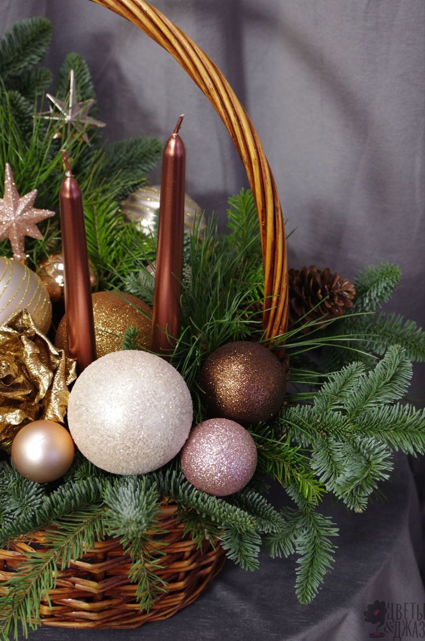 Ветви нобилиса (пихты), сосны, корзина, свечи, флористическая губка, новогодний декор - игрушки и шары, еловые шишки, роза сухоцвет