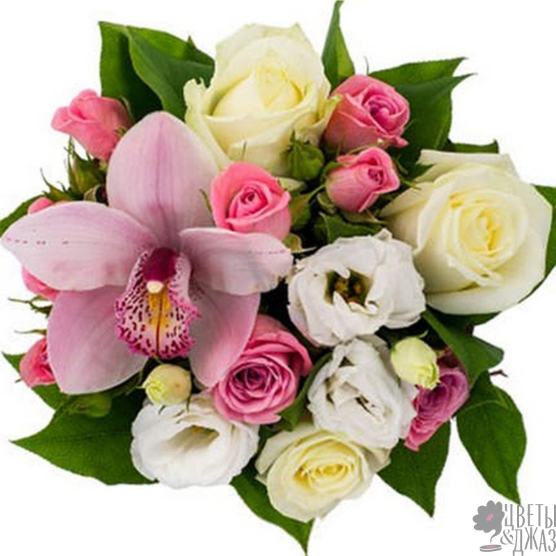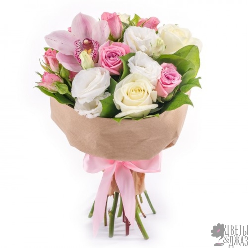 Букет состоит из 8 розовых роз, 3 белые розы, 1 ветка эустомы, 1 орхидея, зелень, крафт, атласная лента.