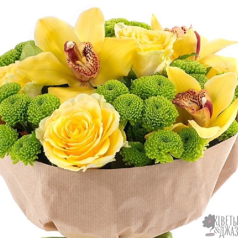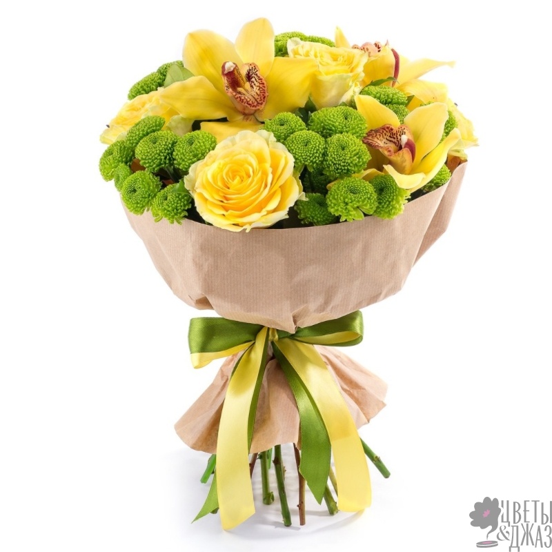 Букет состоит из 4 желтые розы, 3 орхидеи, 6 хризантем Сантини, крафт, атласная лента.