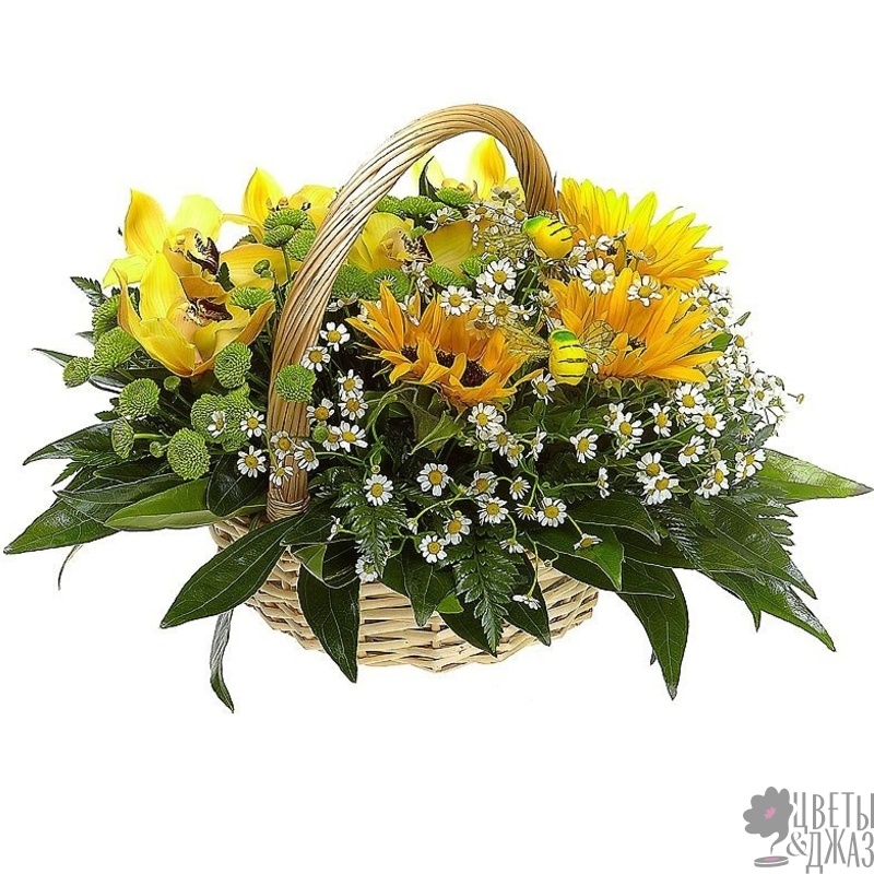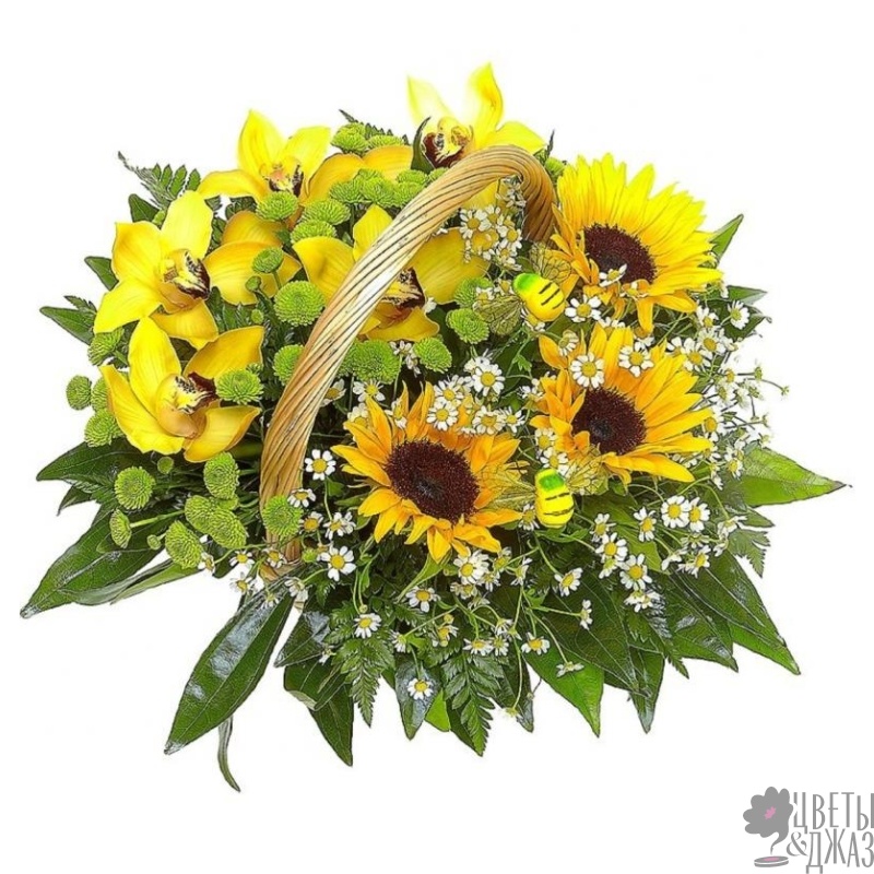 Букет состоит из 3 подсолнуха, 3 ветки хризантемы, 6 веток танацетума, 5 орхидей, зелень, корзина, оазис.